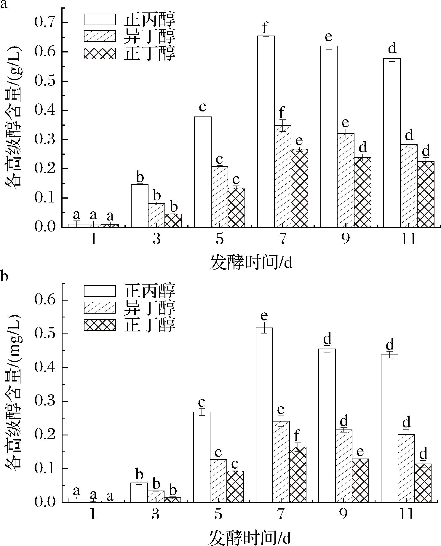 由图6-b可知,正丙醇、异丁醇、正丁醇含量随着发酵时间的延长而升高,第7天达到最高值,全汁发酵高级醇含量分别为0.518、0.241、0.164 g/L,在第7天后开始下降,与图6-a全果发酵相比,全汁发酵高级醇含量明显低于全果发酵,发酵第11天时,全汁发酵高级醇含量为0.753 g/L,全果发酵第11天时高级醇含量为1.085 g/L。