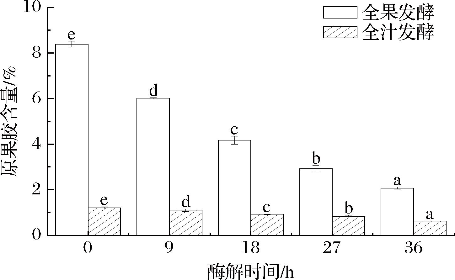 2种发酵方式红枣发酵醪液中的原果胶含量在酶解过程中的变化如图4所示。酶解过程中2种发酵方式发酵醪液中原果胶含量呈降低趋势,变化的原因可能在于酶解过程中,醪液内的原果胶代谢酶活性增强,促使原果胶转化为可溶性果胶,从而导致原果胶的含量减少。经过36 h酶解后,全果全汁发酵醪液中原果胶含量分别为2.07%,0.63%。