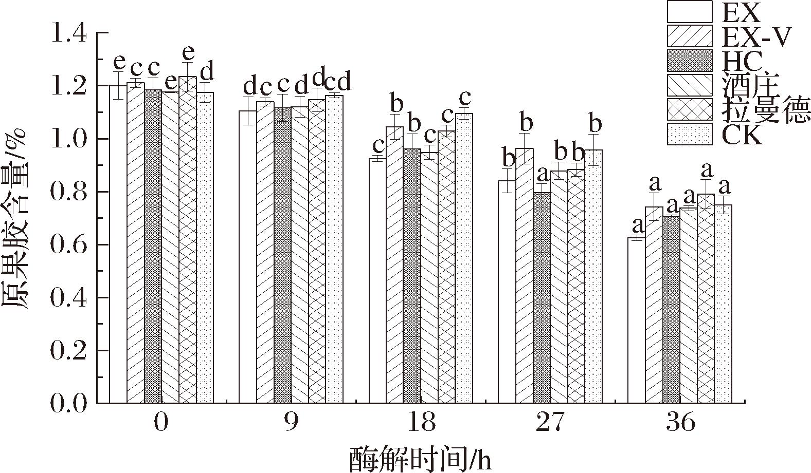 Fig.8 Changes of original pectin content during enzymatic digestion of fermented mash of jujube with different pectinase treatments