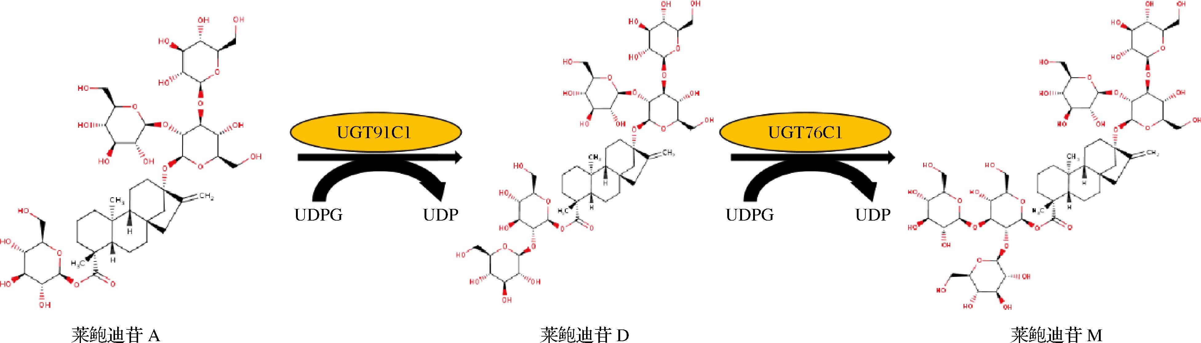 图1 UGT91C1、UGT76G1催化合成莱鲍迪苷M