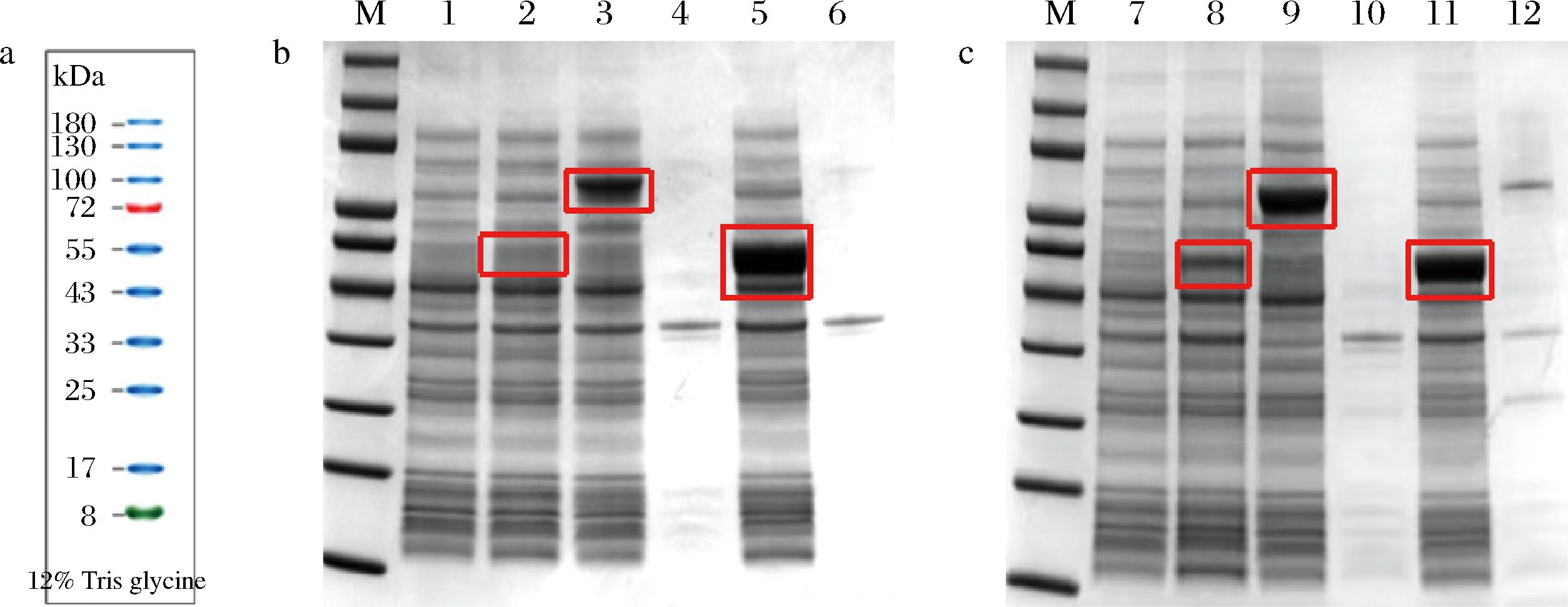 a-预染蛋白marker;b-UGT6G1蛋白胶图;c-UGT91C1蛋白胶图