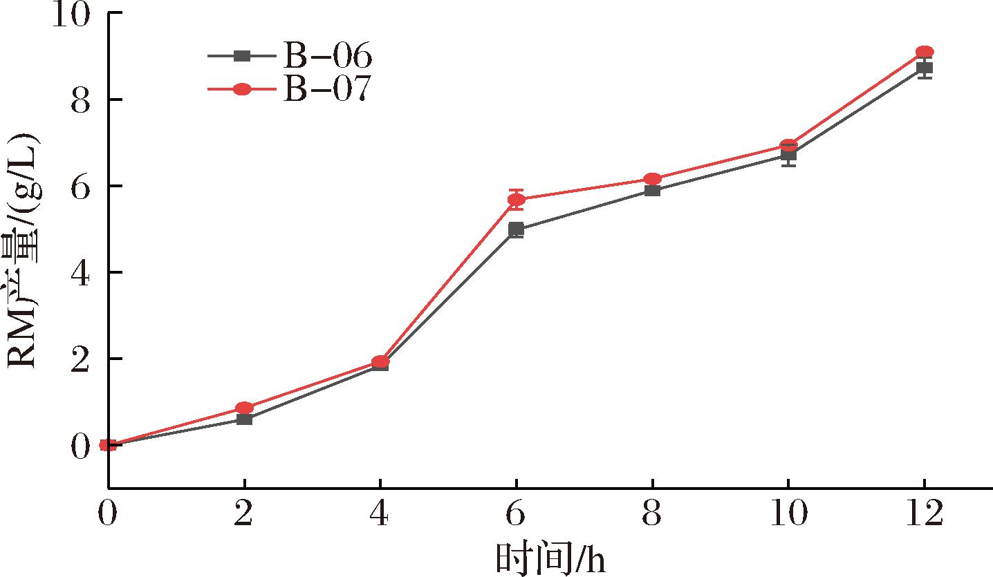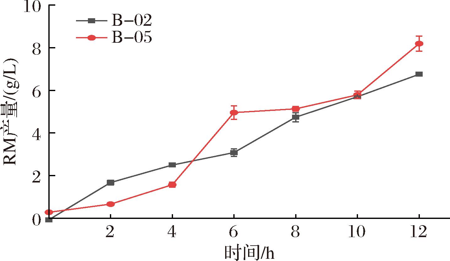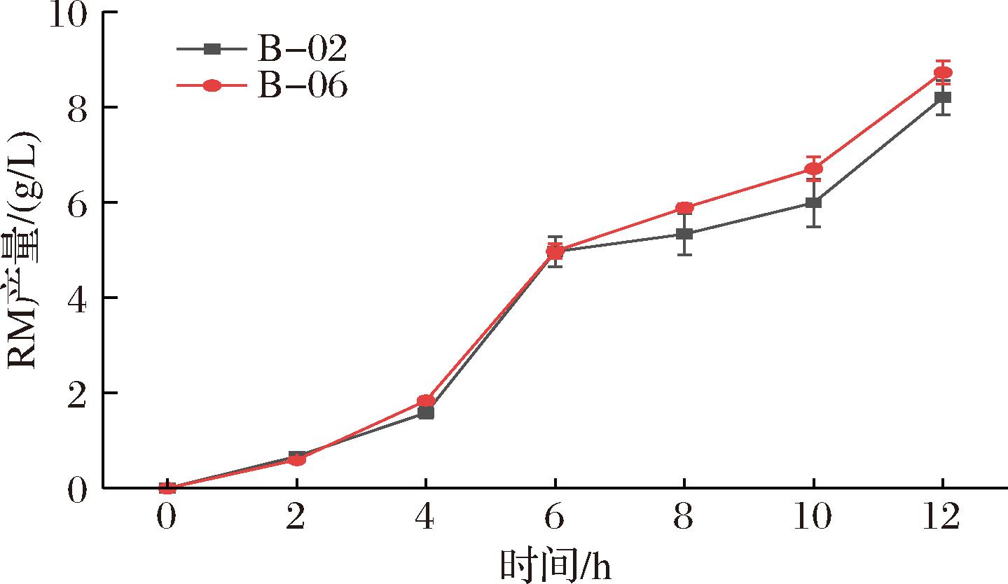 重组菌中所含的重组质粒pET28a-UGT76G1-UGT91C1为诱导型的T7启动子,需要IPTG诱导目的蛋白表达。IPTG 诱导浓度太低不足以结合阻遏蛋白而诱导目的蛋白的转录而降低蛋白表达,太高则会影响重组菌的生长和蛋白表达,并且IPTG 比较昂贵[24]。本研究中针对IPTG的质量浓度开展研究。结果如图10-e所示,随着诱导剂IPTG质量浓度的升高,目的蛋白的表达受到影响进而影响产物生成。从结果来看,添加终浓度0.1 mmol/L的IPTG 时莱鲍迪苷M产量可以达到14.38 g/L,并且考虑到过高质量浓度IPTG会抑制菌体生长进而影响蛋白表达,因此选择0.1 mmol/L为IPTG最适浓度。
