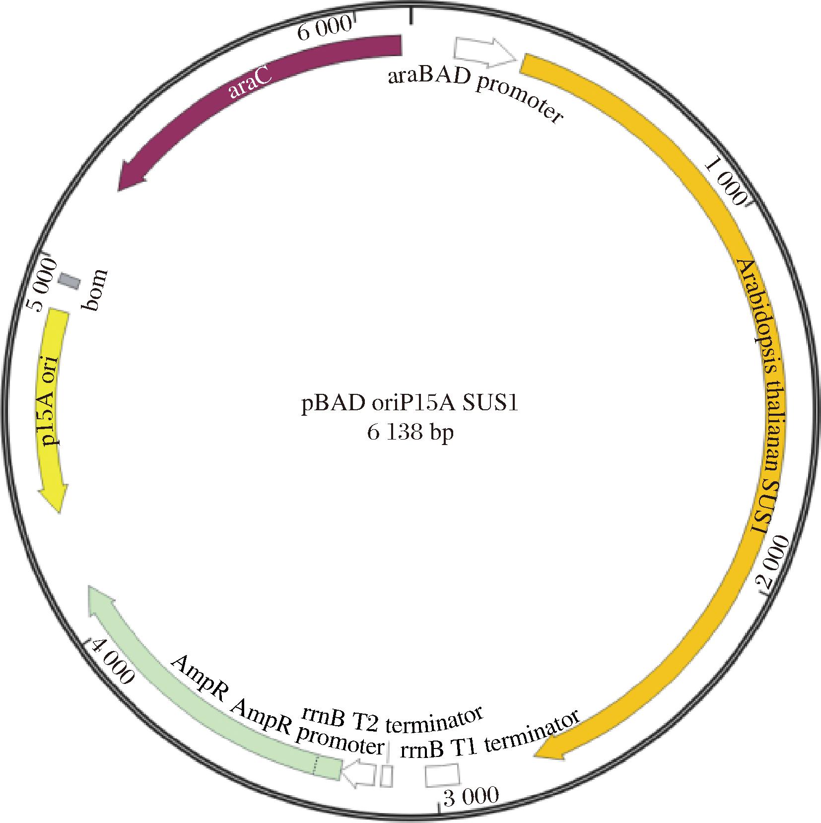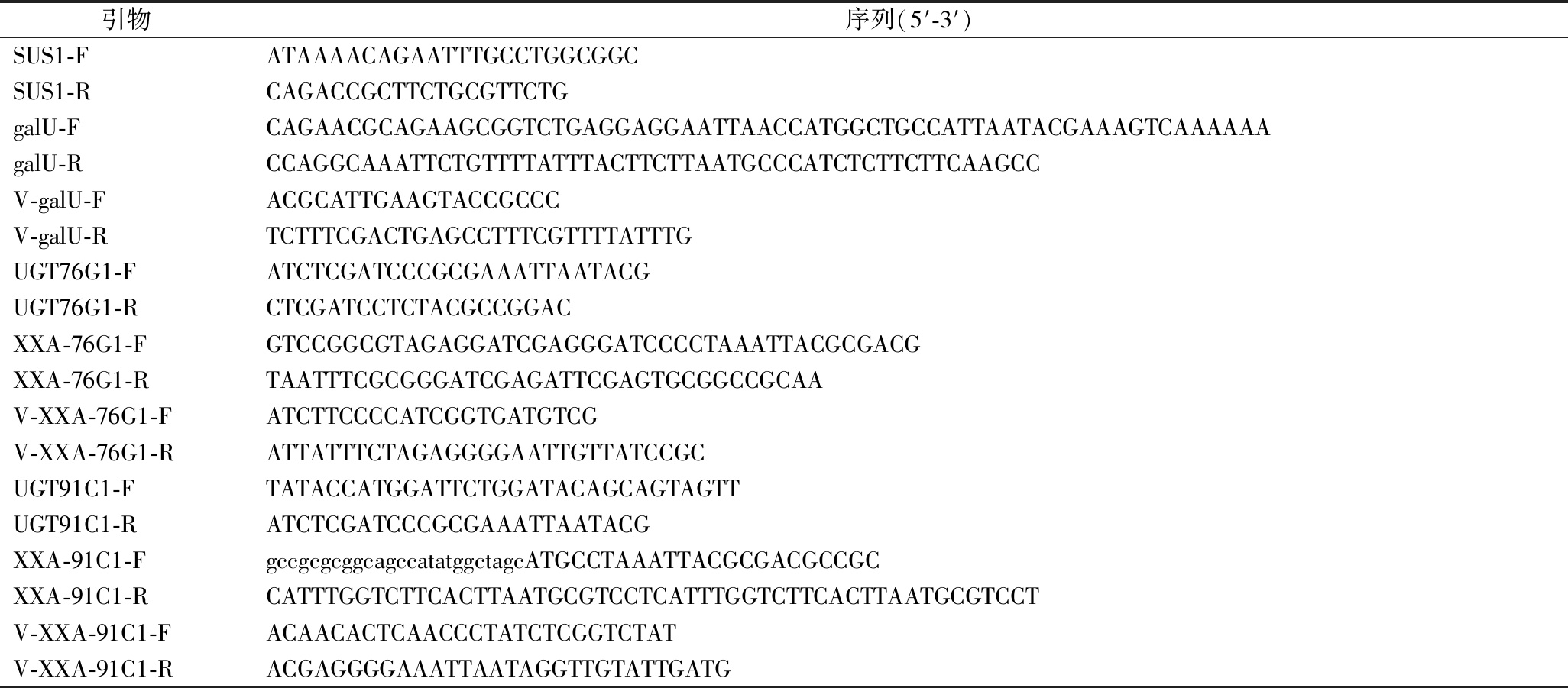 以pBAD-oriP15A-atuSUS1为模板,设计引物SUS1-F、SUS1-R,进行PCR扩增,得到载体片段。以大肠杆菌基因组为模板,设计引物galU-F、galU-R,引物两端分别引入载体pBAD-oriP15A-atuSUS1基因上下游20 bp的碱基,进行PCR扩增,得到含有模板同源臂的目的基因。将模板与目的基因进行同源重组得到质粒pBAD-oriP15A-atuSUS1-galU。引物V-galU-F、V-galU-R用于验证同源重组是否成功。
