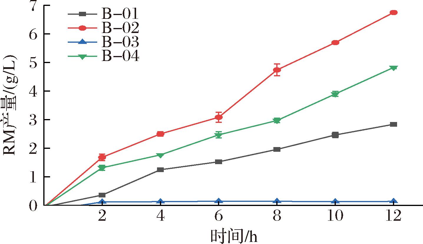 在大肠杆菌中表达异源蛋白时,通常会影响细胞的正常生长和代谢,过早表达会给重组菌带来代谢负担,太晚诱导强度可能不够,影响细胞生长从而降低目的蛋白的产生[23]。结果如图10-c所示,诱导剂添加过早或者过晚都会影响菌株的生长和代谢,4 h添加诱导剂时重组菌生产莱鲍迪苷M的能力最优,因此选择4 h添加诱导剂。