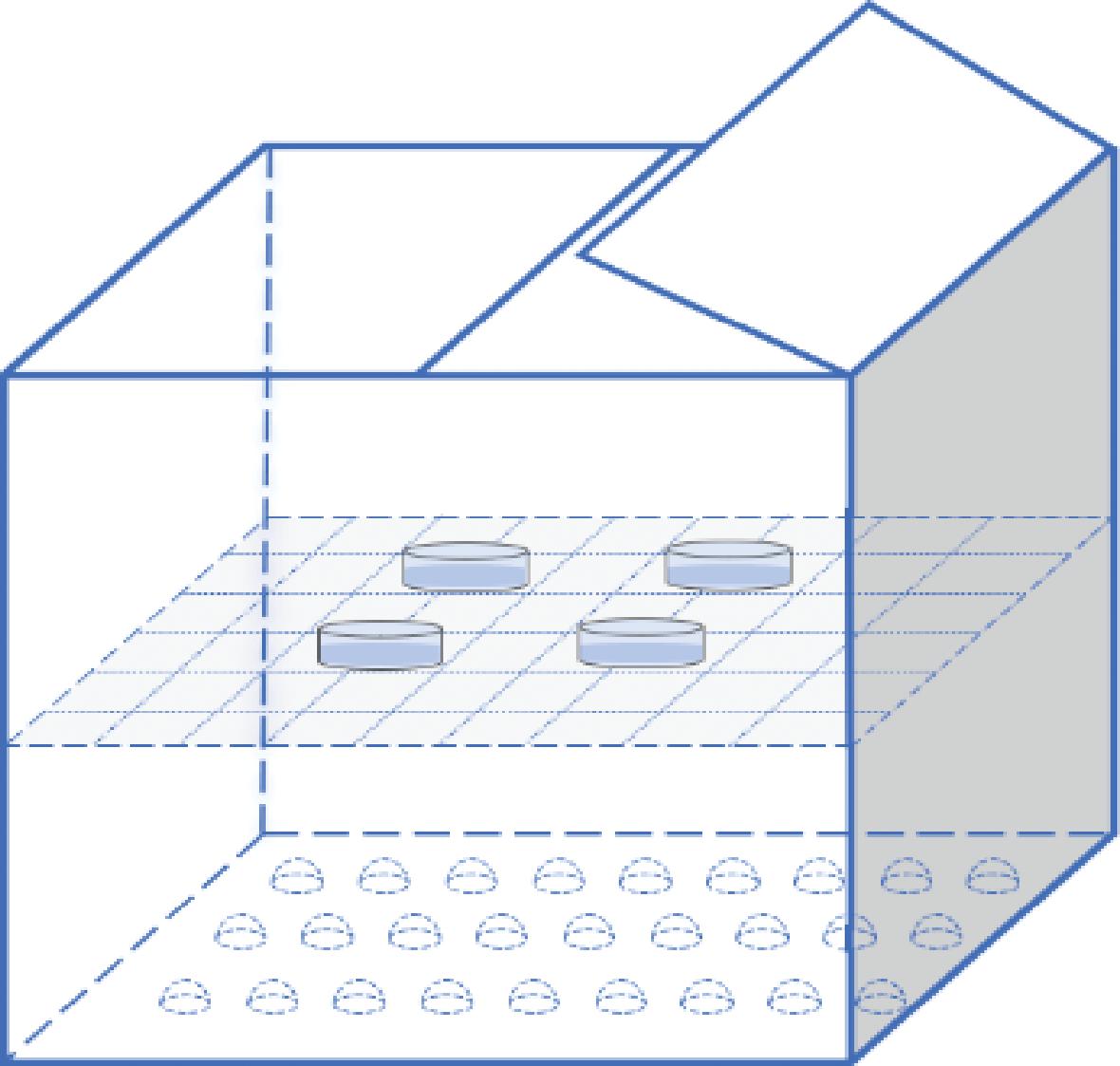 注:图中外层盒子隔绝外部光源,上方开口可便于散热,内部下方放置蓝光LED灯[波长为405 nm,功率为(40±2) W/m2],在LED灯 上方9 cm处固定铁架,需光照处理的培养皿置于铁架上。