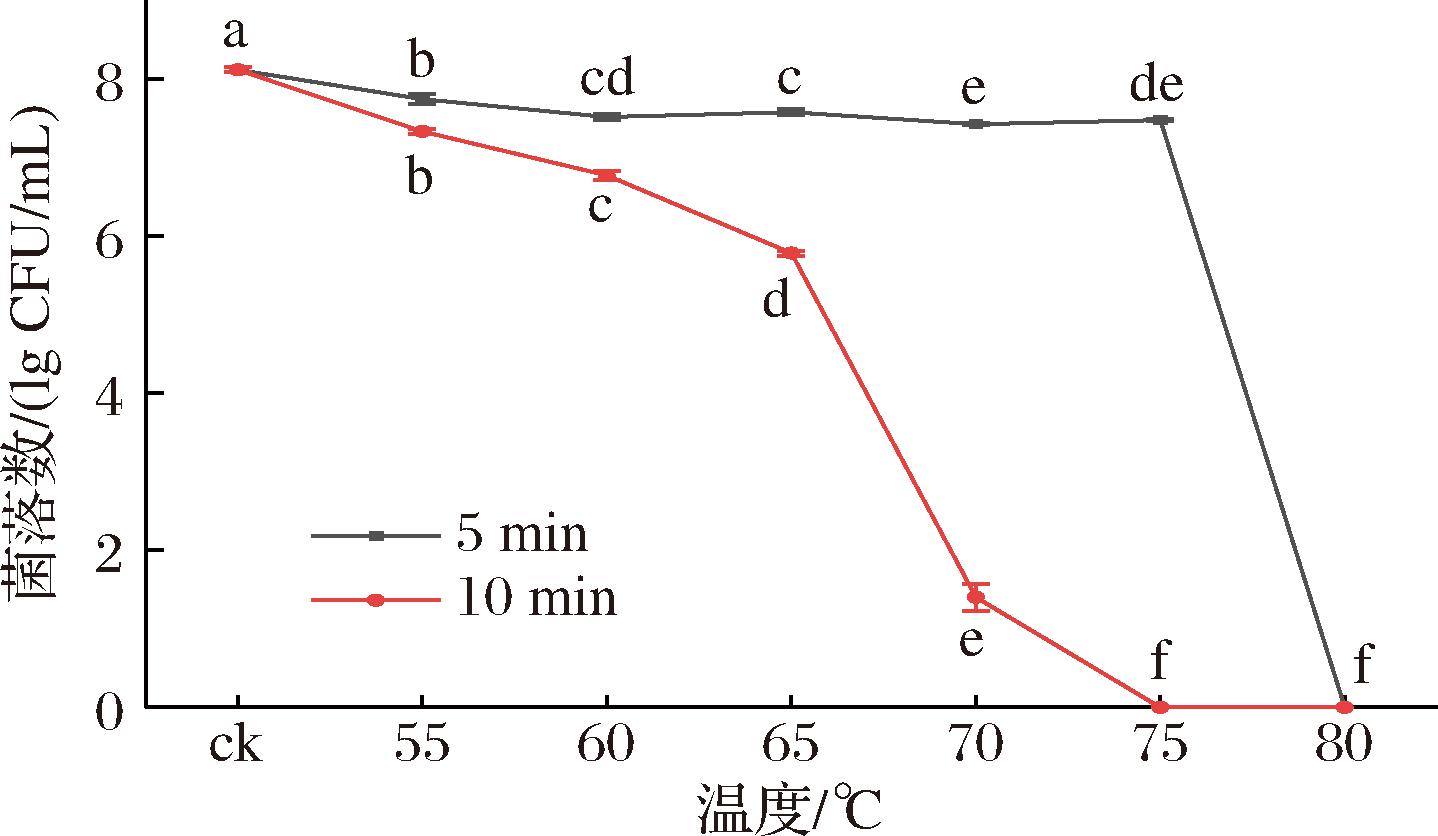 当光照后进行10 min巴氏杀菌处理时,55 ℃的菌落数为7.33 lg CFU/mL、60 ℃时为6.77 lg CFU/mL、65 ℃时为5.79 lg CFU/mL,菌落数逐渐减少,对金黄色葡萄球菌灭活有显著影响。70 ℃巴氏杀菌处理10 min的菌落数比原始菌落数降低了6.72 lg CFU/mL,而75 ℃巴氏杀菌处理10 min后菌落数直接减少至0。