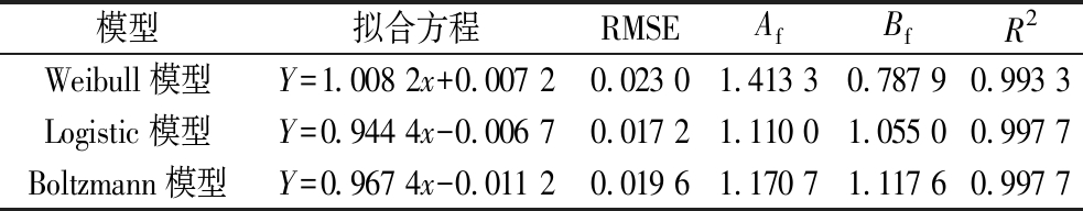 模型拟合方程RMSEAfBfR2Weibull模型Y=1.008 2x+0.007 20.023 01.413 30.787 90.993 3Logistic模型Y=0.944 4x-0.006 70.017 21.110 01.055 00.997 7Boltzmann模型Y=0.967 4x-0.011 20.019 61.170 71.117 60.997 7