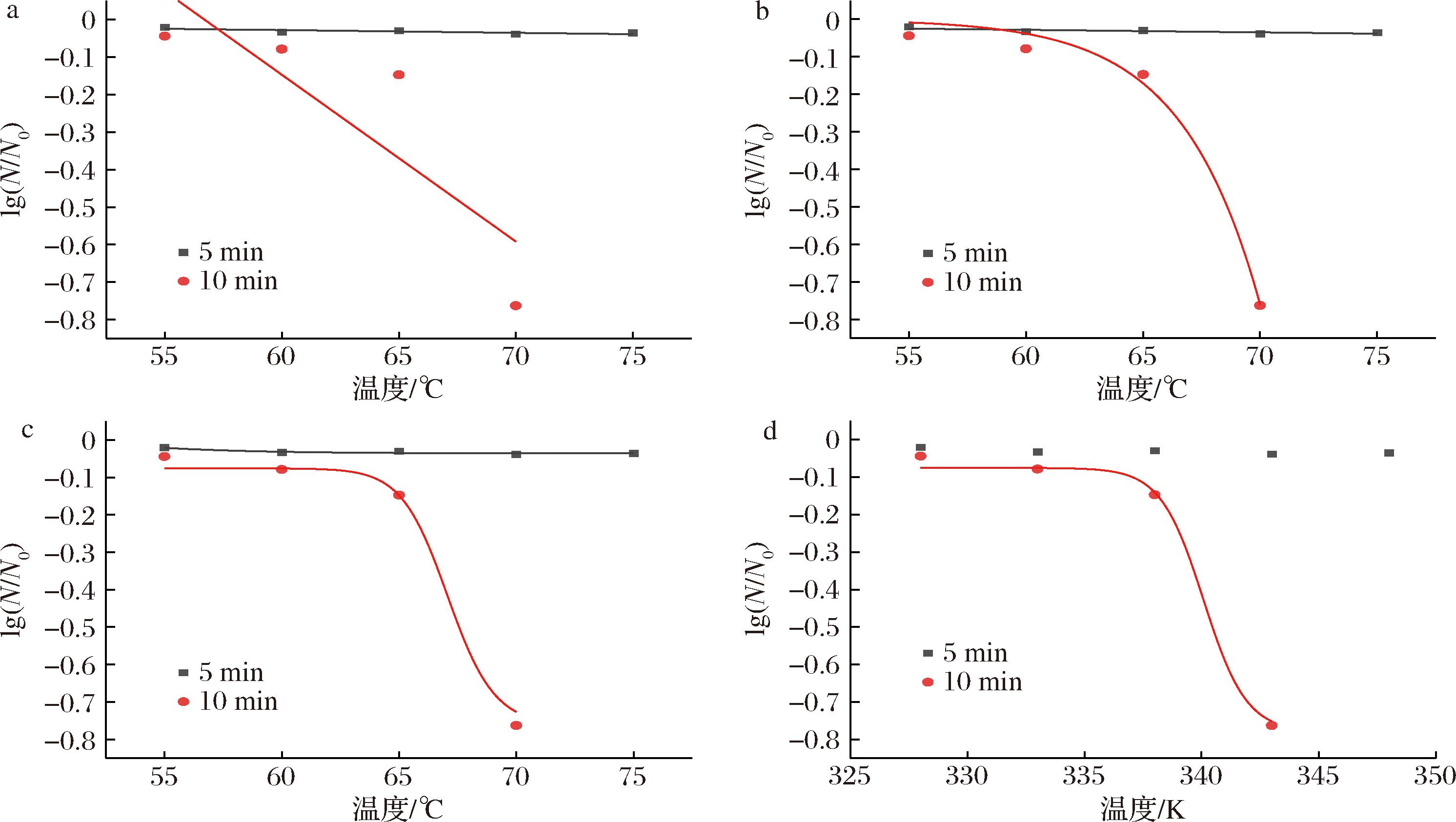式中:N0,未处理前金黄色葡萄球菌的初始菌落数,CFU/mL;N,杀菌处理后的金黄色葡萄球菌数量,CFU/mL;T,温度变量,℃;a,直线截距,其大小表示金黄色葡萄球菌的初始菌落数与处理后菌落数的差异大小;b,直线斜率,其大小表示金黄色葡萄球菌的灭活速率快慢。