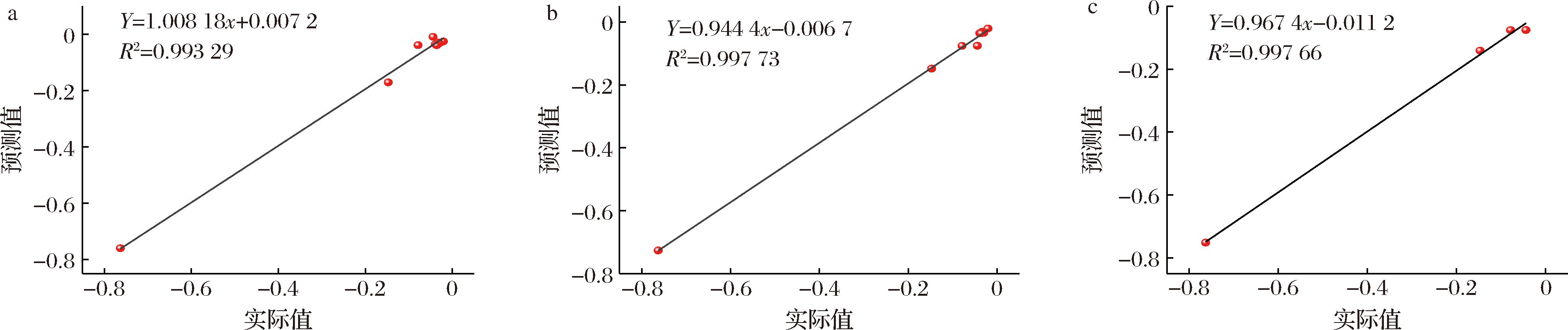 为了进一步比较Weibull模型、Logistic模型和Boltzmann模型的拟合效果,将同一模型不同处理条件下的所有实测值作为横坐标,模型拟合后相应的预测值作为纵坐标,进行线性回归分析。如图4所示,Weibull模型比Logistic模型和Boltzmann模型的斜率更接近于1,而Logistic模型比Weibull模型和Boltzmann模型的R2更大。因此为了更好地比较3种非线性模型在光辅助巴氏杀菌处理条件下的拟合情况,对Af、Bf、R2和RMSE进行分析。由表2可知,Weibull模型的RMSE为0.023 0,Logistic模型的RMSE为0.017 2,Boltzmann模型的RMSE为0.019 6,比较后发现Logistic模型更小,这显示Logistic模型的拟合度好一些;Logistic模型比Weibull模型和Boltzmann模型的Af更小,并且Logistic模型比Weibull模型和Boltzmann模型的Bf和更接近于1,表示Logistic模型的拟合精确度更高。Logistic模型和Boltzmann模型的R2非常接近,因此综合上述4个评价参数后,得出的结论是Logistic模型的拟合度更高一些。