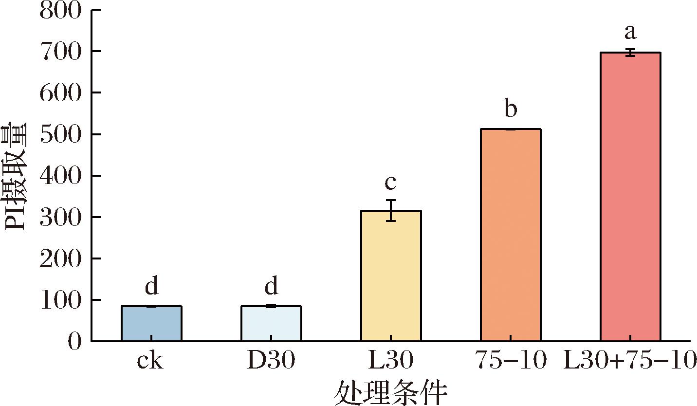 由图6可知,未处理组细菌的PI摄取量为84.67,光照处理30 min的PI摄取量大幅增加为315,是未处理组的3.7倍,这说明光照30 min后细菌的细胞膜受损。刘卿妍[24]研究发现光照破坏了细胞膜完整性和酯酶活性,这验证了本实验光照处理30 min的结果。75 ℃巴氏杀菌处理10 min后的PI摄取量为512,比光照的PI摄取量显著增加了62.54%,同时观察到图5-c~图5-d,红色荧光细胞比例增加,说明细胞膜受损,受损细胞增多,巴氏杀菌处理比光照更能使细胞膜的通透率提高。光辅助巴氏杀菌处理(光照30 min后75 ℃巴氏杀菌处理10 min)的PI值为697,比单独光处理增加了121.30%,比单独热处理增加了36.13%,且图5-e显示红色荧光细胞的密度最大,说明联合方法处理比单一处理对菌体细胞膜损伤的影响更大。CHO等[25]的研究表明,超声波辅助脉冲加热处理与每种条件单独处理相比,对细菌产生了协同作用,导致细菌灭活,这与本研究中光辅助巴氏杀菌的结果一致。