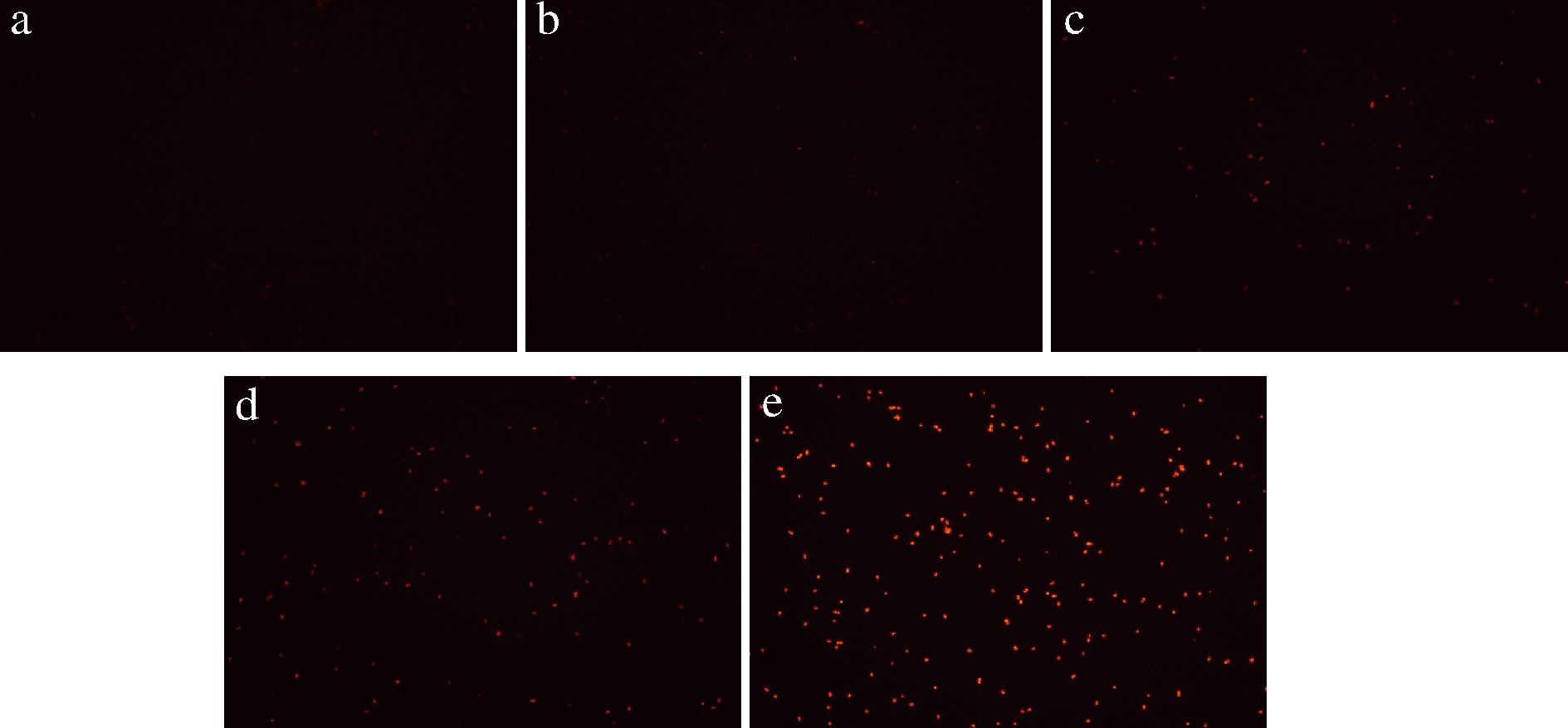 PI荧光染料可以穿过膜受损的死细菌或受伤细菌,从而染上红色荧光,再利用荧光显微镜的观察可看到细菌染色情况,见图5;通过测定PI摄取量,可得知菌体的膜受损情况,见图6。