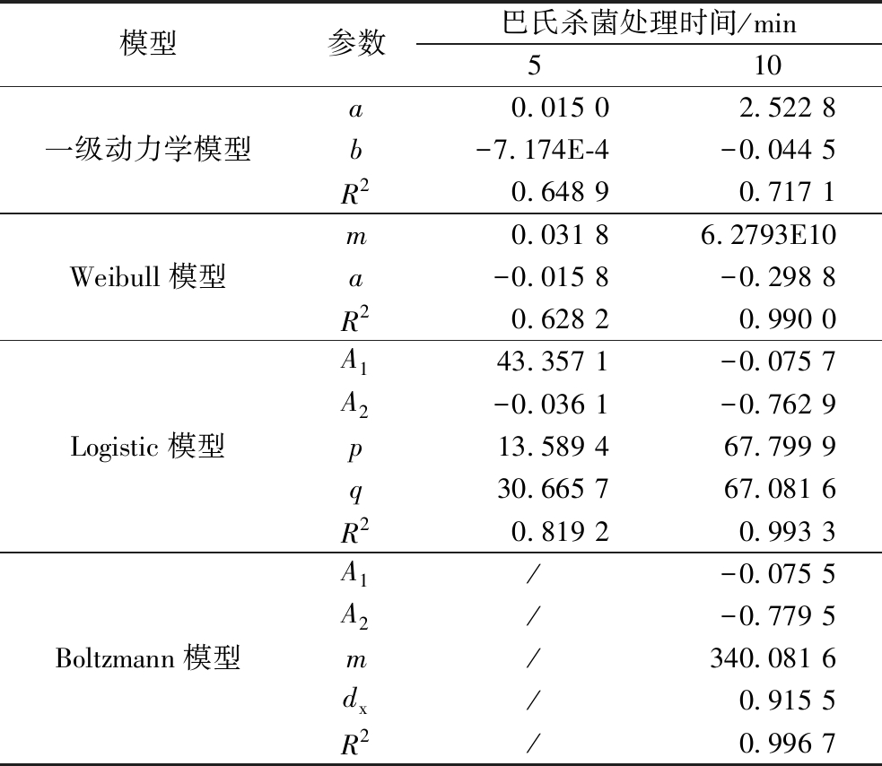 表1 金黄色葡萄球菌杀菌效果的4种动力学模型参数