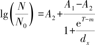 式中:N0,未处理前金黄色葡萄球菌的初始菌落数,CFU/mL;N,杀菌处理后的金黄色葡萄球菌数量,CFU/mL;T,温度变量,K;A1,尺度参数,其越大表明杀菌效果越显著;A2、m、dx均为形状参数,当A2越大时曲线“S”形状越紧缩,越小时曲线“S”形状越舒展;当m越大时形状越向上凸,m越小时形状越下凹;当dx越大时向上凸程度越大。