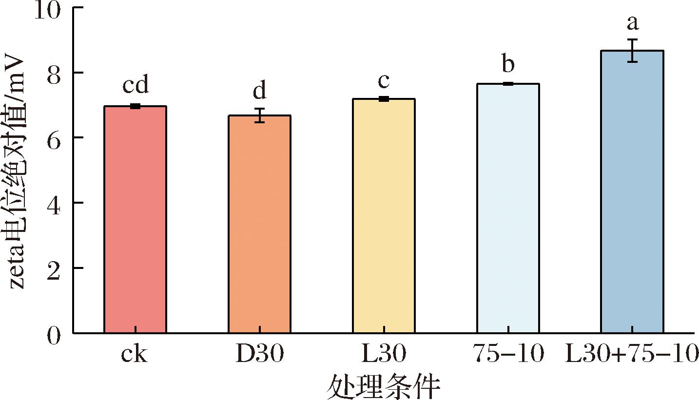 由图7可知,黑暗条件处理30 min(zeta电位绝对值为6.68 mV)低于未处理(zeta电位绝对值为6.958 mV)但没有显著性差异,可能是细菌在牛乳中聚集,导致电荷减少,zeta电位绝对值减小。光照30 min(zeta电位绝对值为7.18 mV)比黑暗30 min处理的zeta电位绝对值大,是因为光照30 min使细胞受损,内容物泄露,携带的电荷增多,导致zeta电位绝对值变大。75 ℃巴氏杀菌处理10 min与光照30 min相比有显著性差异,且75 ℃巴氏杀菌处理10 min 的zeta电位绝对值更大,可能是75 ℃巴氏杀菌处理10 min后有更多的细胞受损,巴氏杀菌处理中细菌的损伤比光照处理更严重。光照30 min后75 ℃巴氏杀菌处理10 min的zeta电位绝对值为8.67 mV,显著高于其他处理的zeta电位绝对值,是因为光照和巴氏杀菌处理的协同作用,更大程度地使细胞膜受损,释放出来的小分子物质增多,随之产生的正负电荷也增多,因此zeta电位绝对值变大。
