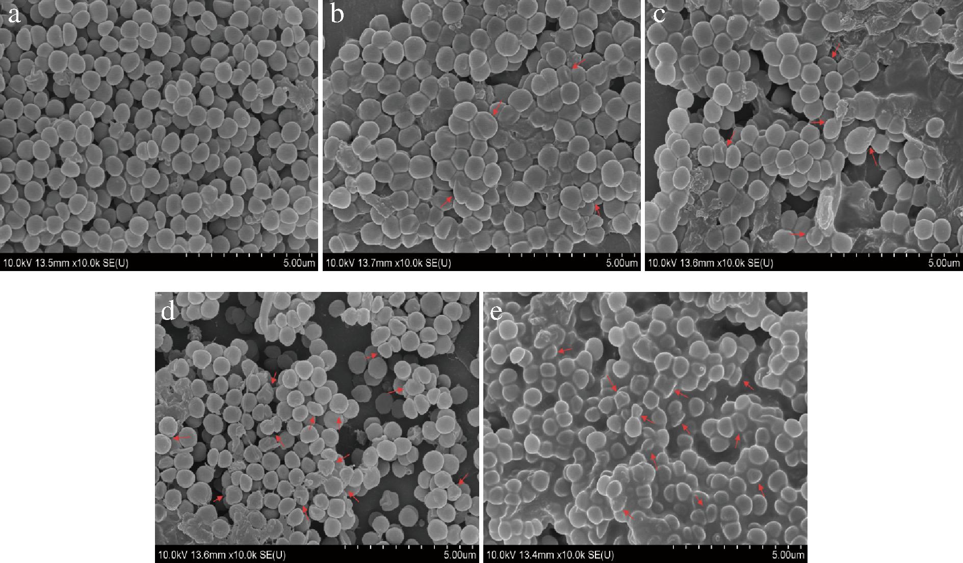 为了探究光辅助巴氏杀菌处理对牛乳中金黄色葡萄球菌形态结构的破坏情况,通过扫描电镜对金黄色葡萄球菌的微观结构进行观察,如图9所示。未处理的菌体表面光滑,呈椭圆形,表现出正常的细胞形态(图9-a)。黑暗30 min处理的菌体外轮廓清晰,但个别菌体表面凹陷,可能由于菌体在牛乳中竞争性生长造成的(图9-b)。光照30 min处理后,部分细胞中部凹陷、边缘破裂(图9-c),整体观察可知黑暗30 min和光照30 min对细胞形态的影响较小,仍有较多细胞较为完整。而75 ℃巴氏杀菌处理10 min和光照30 min后75 ℃巴氏杀菌处理10 min处理均使菌体结构有不同程度的破坏,细胞已有明显的形态变化(图9-d、图9-e)。75 ℃单独热处理后细胞发生变形,细胞表面皱缩不光滑,且多数表面有凹陷,部分细胞内容物渗出。光照30 min后75 ℃巴氏杀菌处理10 min,使金黄色葡萄球菌表面有明显损伤,形态发生严重变形,细胞结构已经不完整,并伴有胞质内容物外泄及细胞间异常黏附。结果表明光辅助巴氏杀菌处理对金黄色葡萄球菌的细胞膜及细胞质造成伤害,光照与巴氏杀菌处理协同作用加剧了细菌细胞的裂解,这与2.4节中细胞膜通透性的PI测定结果对应。