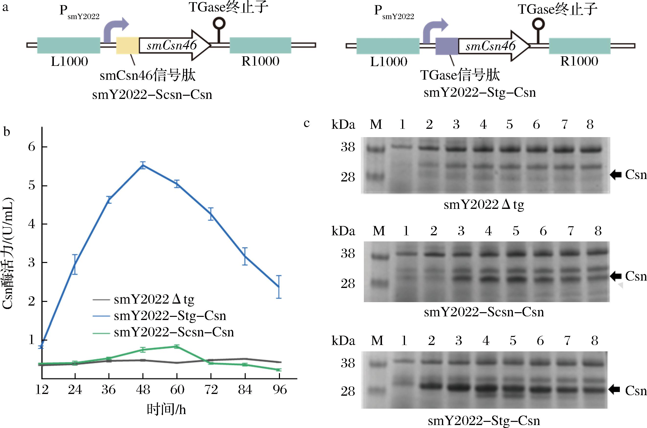 S.mobaraensis长期以来主要用于TGase发酵生产,TGase是其主要的胞外蛋白。前期研究中,通过从S.mobaraensis突变株smY2022中删除TGase基因,构建了一株突变株smY2022Δtg,为外源基因的表达提供了新的宿主[11]。为实现smCsn46在S.mobaraensis中的高效表达,本研究从S.mobaraensis DSM40587基因组中扩增得到包含和不包含内源信号肽的smCsn46基因。基于CRISPR/Cas9系统,将smCsn46基因整合至smY2022Δtg的TGase基因位点,构建了重组菌株smY2022-Scsn-Csn和smY2022-Stg-Csn。这些菌株在TGase启动子和终止子的调控下表达smCsn46(图3-a)。为了评估信号肽对表达的影响,分别使用smCsn46和TGase的信号肽序列表达smCsn46,构建了smY2022-Scsn-Csn和smY2022-Stg-Csn(图3-a)。
