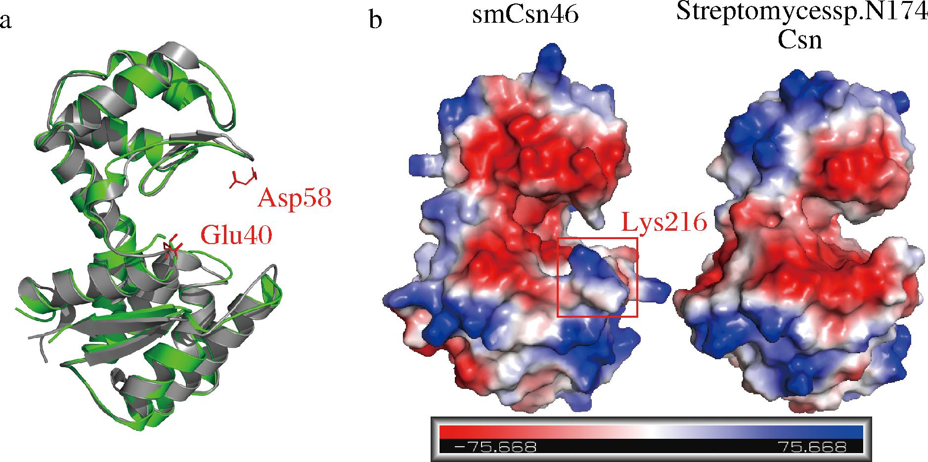 a-SWISS-MODEL根据链霉菌属Csn的晶体结构预测smCsn46的三级结构(绿色),来自Streptomyces sp.N174(PDB ID:1CHK,以灰色显 示);b-smCsn46和来自Streptomyces sp.N174的Csn表面静电荷