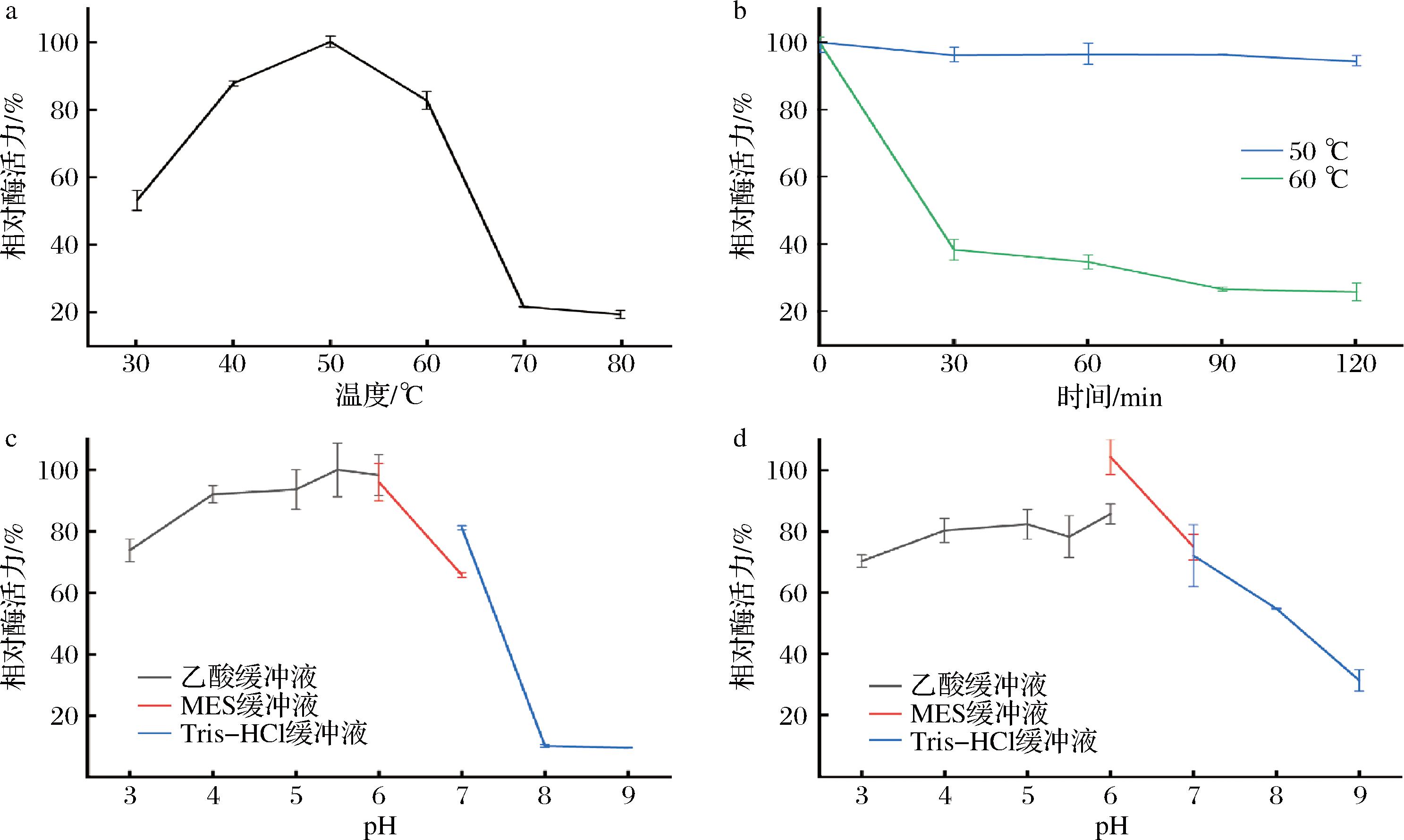 将酶液稀释至0.15~0.2 mg/mL后进行酶学性质分析。为测定最适的反应温度,分别在30~80 ℃和pH 5.5测定酶活力;计算各温度下相对于50 ℃和pH 5.5酶活力的百分比。为测定酶热稳定性,将稀释后的酶液在不同温度下分别孵育0~120 min,每30 min取样测定酶活力;计算不同孵育时间样品的相对酶活力,在50 ℃和pH 5.5孵育0 min时的酶活力为100%。为测定最适反应pH,在50 ℃测定不同pH环境的酶活力;pH 3~6使用乙酸-乙酸钠缓冲液,pH 6~7使用MES缓冲液,pH 7~9使用Tris-HCl缓冲液;缓冲液浓度均为200 mmol/L。计算各pH环境的相对酶活力,以50 ℃和pH 5.5的酶活力为100%。为测定pH稳定性,分别使用上述缓冲液稀释酶液,于50 ℃下孵育120 min,测定孵育后残余酶活力;计算不同孵育时间样品的相对酶活力,以50 ℃和pH 5.5孵育0 min时的酶活力为100%。