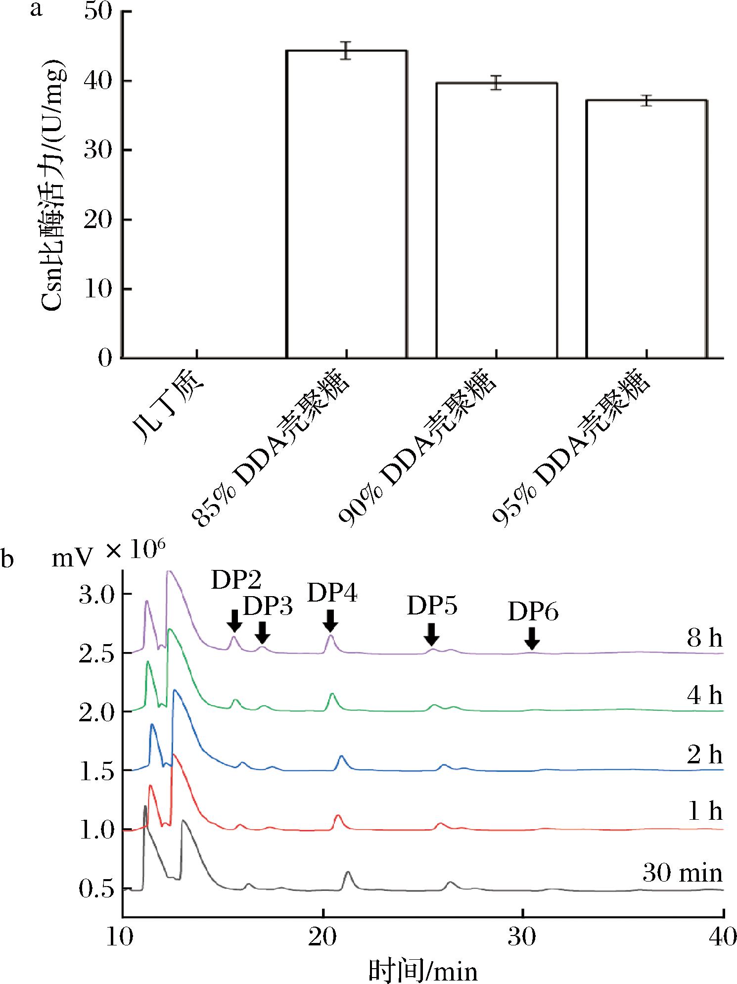 a-smCsn46底物特异性(使用具有不同DD的各种壳聚糖底物测量smCsn46的酶活力,以评估其底物偏好);b-对smCsn46 催化的95% DD的壳聚糖水解产物进行HPLC分析[聚合度(degree of polymeri- zation,DP)范围为 2~6 的产品用箭头表示]