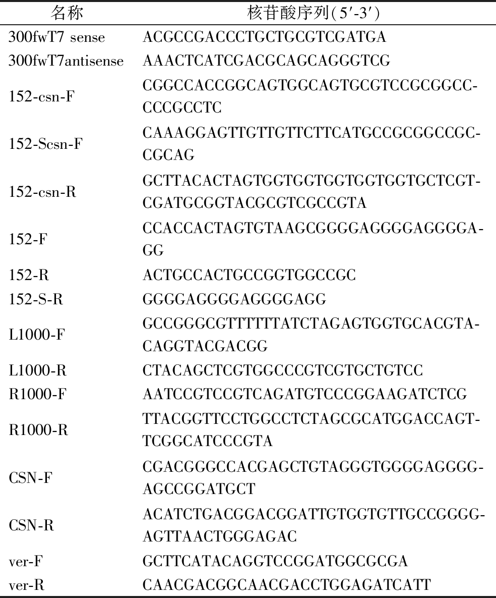 名称核苷酸序列(5′-3′)300fwT7 senseACGCCGACCCTGCTGCGTCGATGA300fwT7antisenseAAACTCATCGACGCAGCAGGGTCG152-csn-FCGGCCACCGGCAGTGGCAGTGCGTCCGCGGCC-CCCGCCTC152-Scsn-FCAAAGGAGTTGTTGTTCTTCATGCCGCGGCCGC-CGCAG152-csn-RGCTTACACTAGTGGTGGTGGTGGTGGTGCTCGT-CGATGCGGTACGCGTCGCCGTA152-FCCACCACTAGTGTAAGCGGGGAGGGGAGGGGA-GG152-RACTGCCACTGCCGGTGGCCGC152-S-RGGGGAGGGGAGGGGAGGL1000-FGCCGGGCGTTTTTTATCTAGAGTGGTGCACGTA-CAGGTACGACGGL1000-RCTACAGCTCGTGGCCCGTCGTGCTGTCCR1000-FAATCCGTCCGTCAGATGTCCCGGAAGATCTCGR1000-RTTACGGTTCCTGGCCTCTAGCGCATGGACCAGT-TCGGCATCCCGTACSN-FCGACGGGCCACGAGCTGTAGGGTGGGGAGGGG-AGCCGGATGCTCSN-RACATCTGACGGACGGATTGTGGTGTTGCCGGGG-AGTTAACTGGGAGACver-FGCTTCATACAGGTCCGGATGGCGCGAver-RCAACGACGGCAACGACCTGGAGATCATT