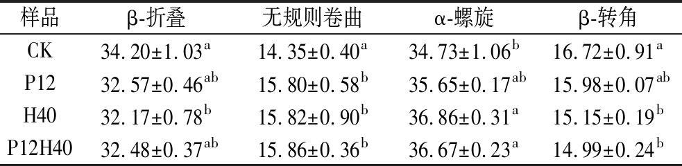 样品β-折叠无规则卷曲α-螺旋β-转角CK34.20±1.03a14.35±0.40a34.73±1.06b16.72±0.91aP1232.57±0.46ab15.80±0.58b35.65±0.17ab15.98±0.07abH4032.17±0.78b15.82±0.90b36.86±0.31a15.15±0.19bP12H4032.48±0.37ab15.86±0.36b36.67±0.23a14.99±0.24b