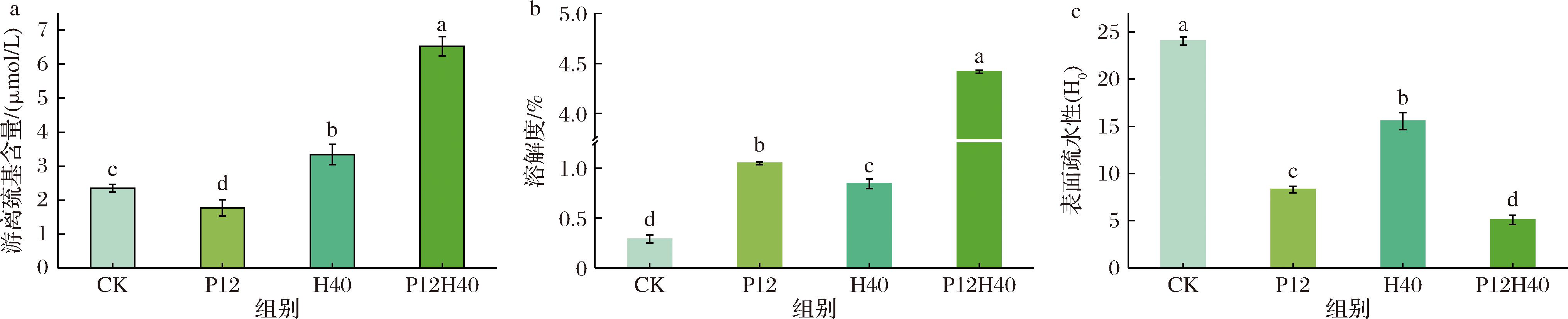 图2 不同处理下CPI的游离巯基含量、溶解度、表面疏水性
