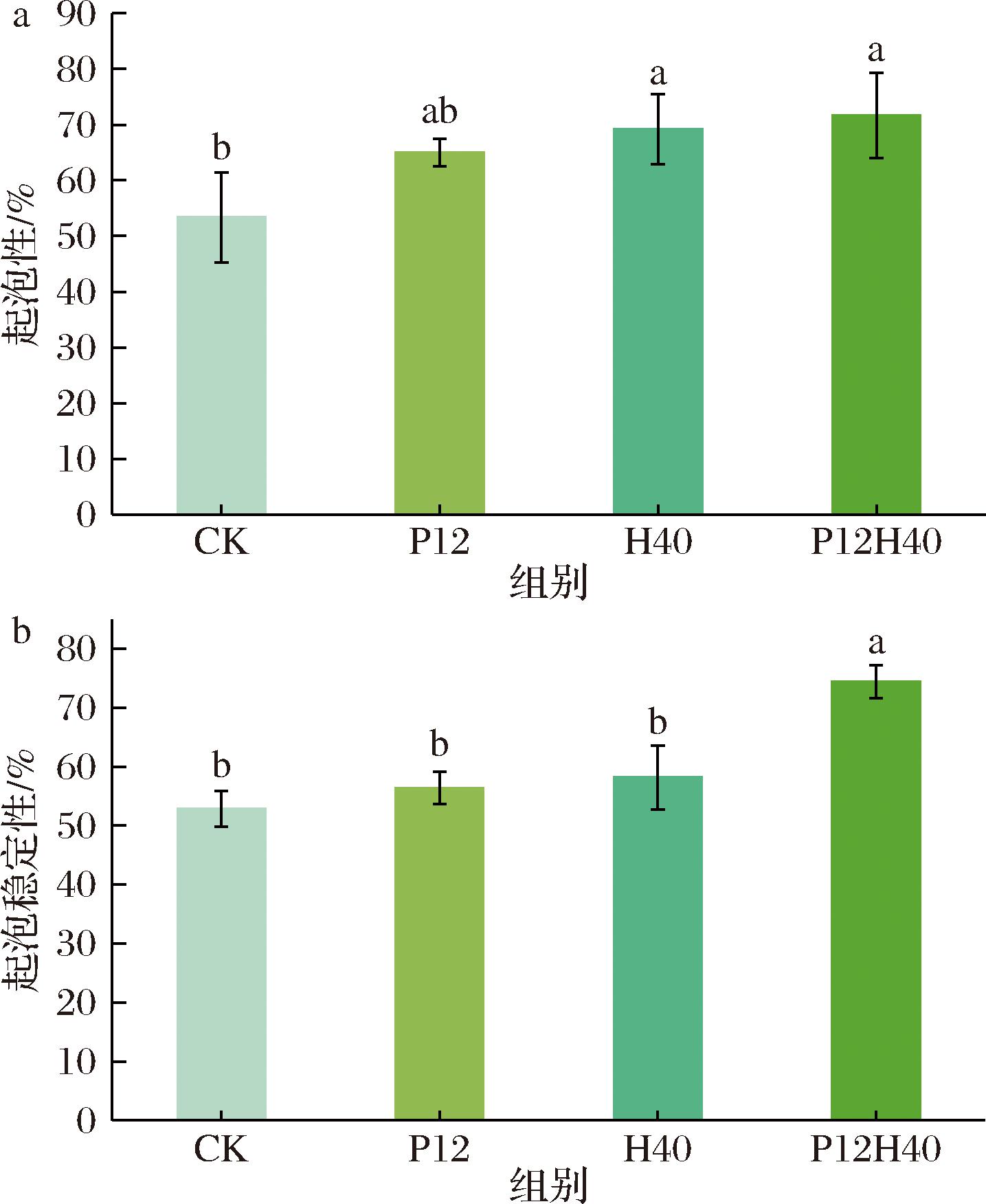 起泡特性反映了蛋白在空气-水界面处吸附、重排和保持稳定性的能力。如图6所示,与CK相比,改性CPI样品的起泡性均提高。P12中起泡性增加可能是因为在极端碱性条件下蛋白质分子部分展开,中性pH回调后CPI呈熔融状态,粒径减小,使其易吸附到空气-水界面上,从而使起泡性增加[17];H40中可能是因为高压均质破坏了蛋白质中的疏水相互作用和离子键,使蛋白质分子更加灵活,增强了蛋白质分子在空气-水界面的吸附能力,从而增加了起泡性[33];P12H40中增加可能是因为pH值变化和高压均质的剪切和空化效应改善了分子迁移率和柔韧性,增强了起泡性[23]。改性CPI的起泡稳定性均优于CK,可能是因为改性CPI携带的表面电荷降低,分子间静电斥力减弱,促使蛋白质-蛋白质相互作用增强,进而有利于增强蛋白质的泡沫稳定性[34]。这与zeta电位的结果一致,较低的zeta电位绝对值意味着颗粒间的静电屏障减小,有利于蛋白质在气-水界面紧密聚集,维持泡沫的稳定性。