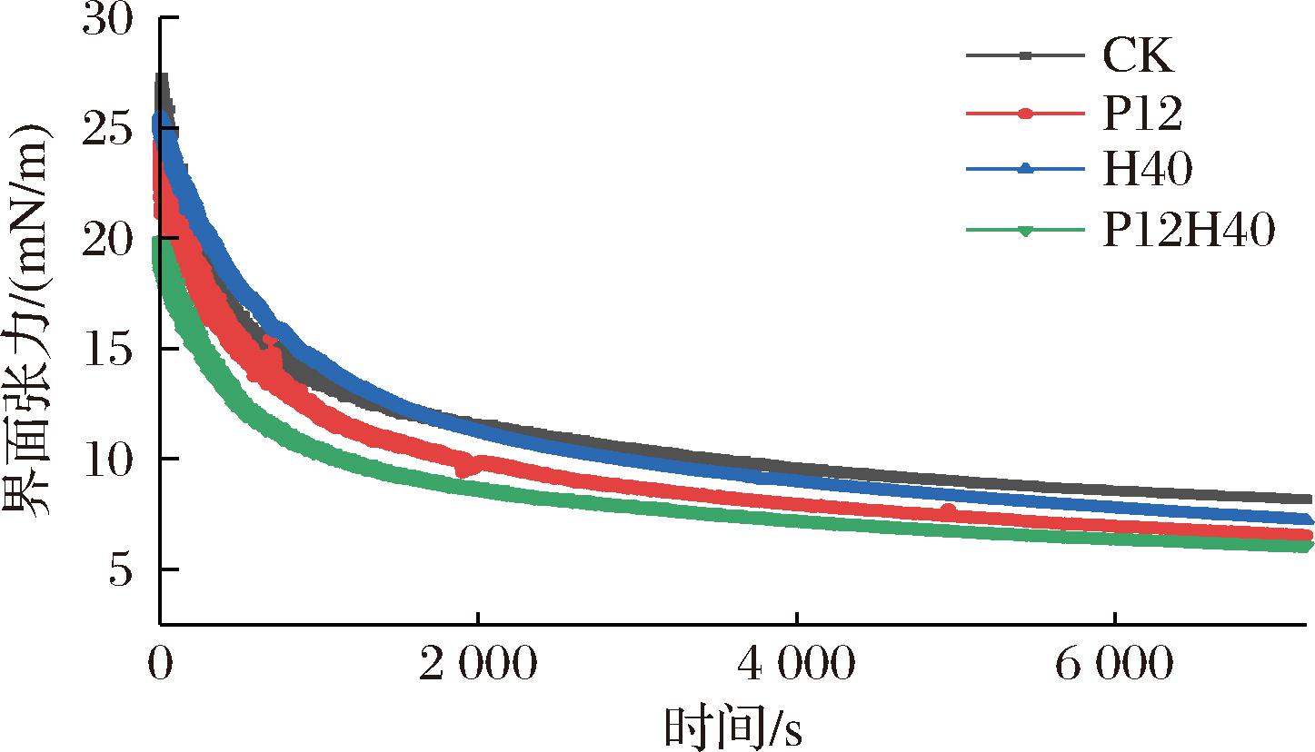 蛋白质的活性是由分子在油水界面的扩散和吸附能力决定的。从图8可知,相较于CK,P12、H40和P12H40的界面张力均下降,从26.12 mN/m降至19.89 mN/m。在油-水界面中,各体系的界面张力随时间的增加而迅速下降,随后趋于平缓。这可能是因为pH值变化和高压均质使蛋白质的粒径减小,从而能够快速向油水界面扩散,同时电位绝对值降低使其静电斥力减弱,有利于蛋白吸附到油水界面上,从而降低界面张力[35]。其中P12H40显著降低可能是因为两者之间的协同作用加剧了蛋白质的结构展开和伸展,因此其界面张力最低。此外,改性CPI溶解度的增加使得蛋白质分子与油水界面的相互作用加大,亦可导致界面张力的降低[23]。