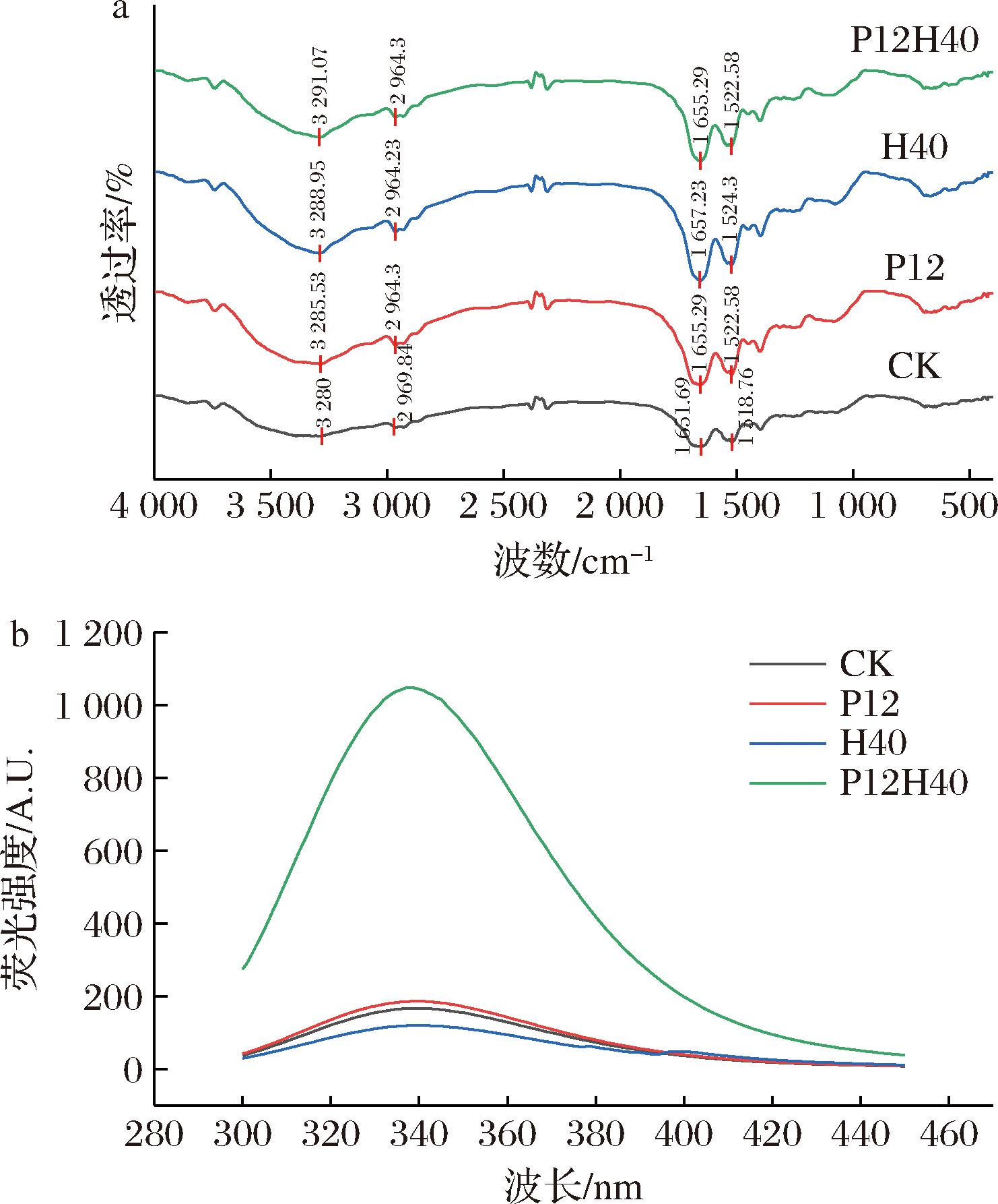 O双键拉伸振动峰值(1 600~1 700 cm-1),酰胺Ⅱ带包括C—N拉伸振动和N—H弯曲振动峰值(1 500~1 600 cm-1)。如图4-a所示,样品在3 200~3 500 cm-1出现较宽的羟基吸收峰,主要是由O—H和N—H伸缩振动引起的,与CK相比,P12、H40和P12H40的羟基吸收峰从3 280 cm-1分别红移至3 285.53、3 288.95、3 291.07 cm-1,表明改性处理后可以增强CPI分子间的氢键作用[26]。2 964 cm-1附近的吸收峰是由—CH3和—CH2—基团中的C—H伸缩振动产生的。与CK相比,P12、H40、P12H40在酰胺Ⅱ带处的吸收峰均发生不同程度的红移,表明蛋白结构发生了不同程度的展开[27]。改性CPI均在酰胺Ⅰ带发生了红移,表明改性后CPI的二级结构发生了变化[27]。