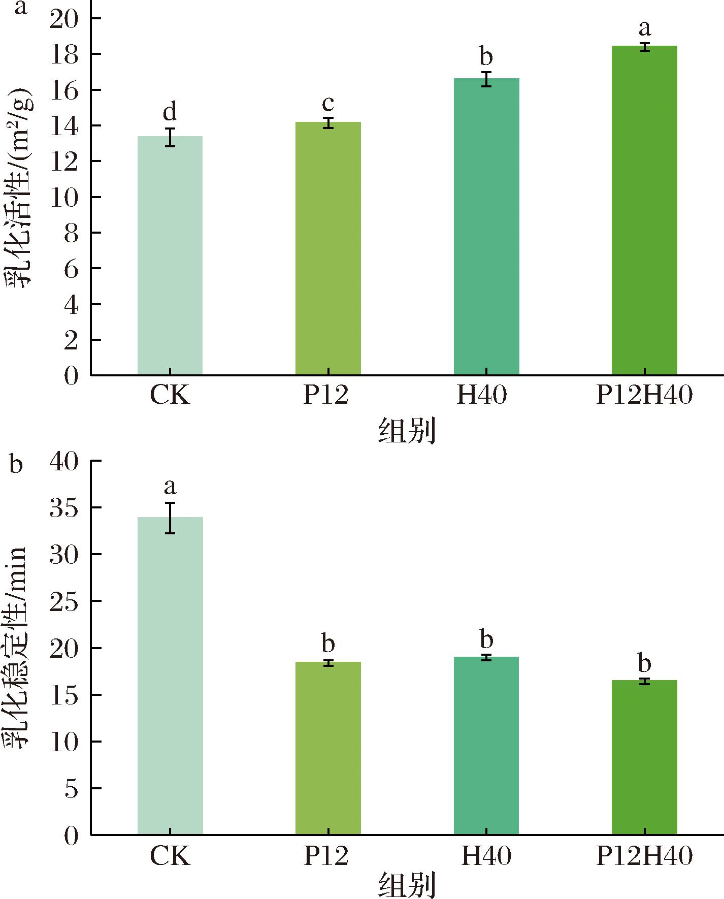 乳化活性和乳化稳定性可以评价蛋白质分子的乳化性能,代表着蛋白质油水界面稳定分散的能力。如图7-a所示,与CK相比,其P12、H40、P12H40的样品均显著提高,从13.34 m2/g增至18.40 m2/g。可能是由于CPI在极碱条件下发生分子解聚,使其蛋白质粒径减小,而高压均质进一步产生的剪切力、空化效应等降低了颗粒尺寸,增强了油水界面的吸附和重排,从而使其乳化活性增加[35]。同时,改性CPI的表面疏水性降低,但ANS探针检测仅结合暴露的疏水斑块,若改性后疏水区被亲水基团部分屏蔽,即使表面疏水性降低,但内部或局部仍存在油脂结合位点,从而使其乳化活性升高[36]。如图7-b所示,改性CPI的乳化稳定性均低于CK,可能是因为展开的蛋白质分子灵活性增强,限制了分子间的相互作用,形成了弱的界面膜,从而导致乳化稳定性降低[34]。