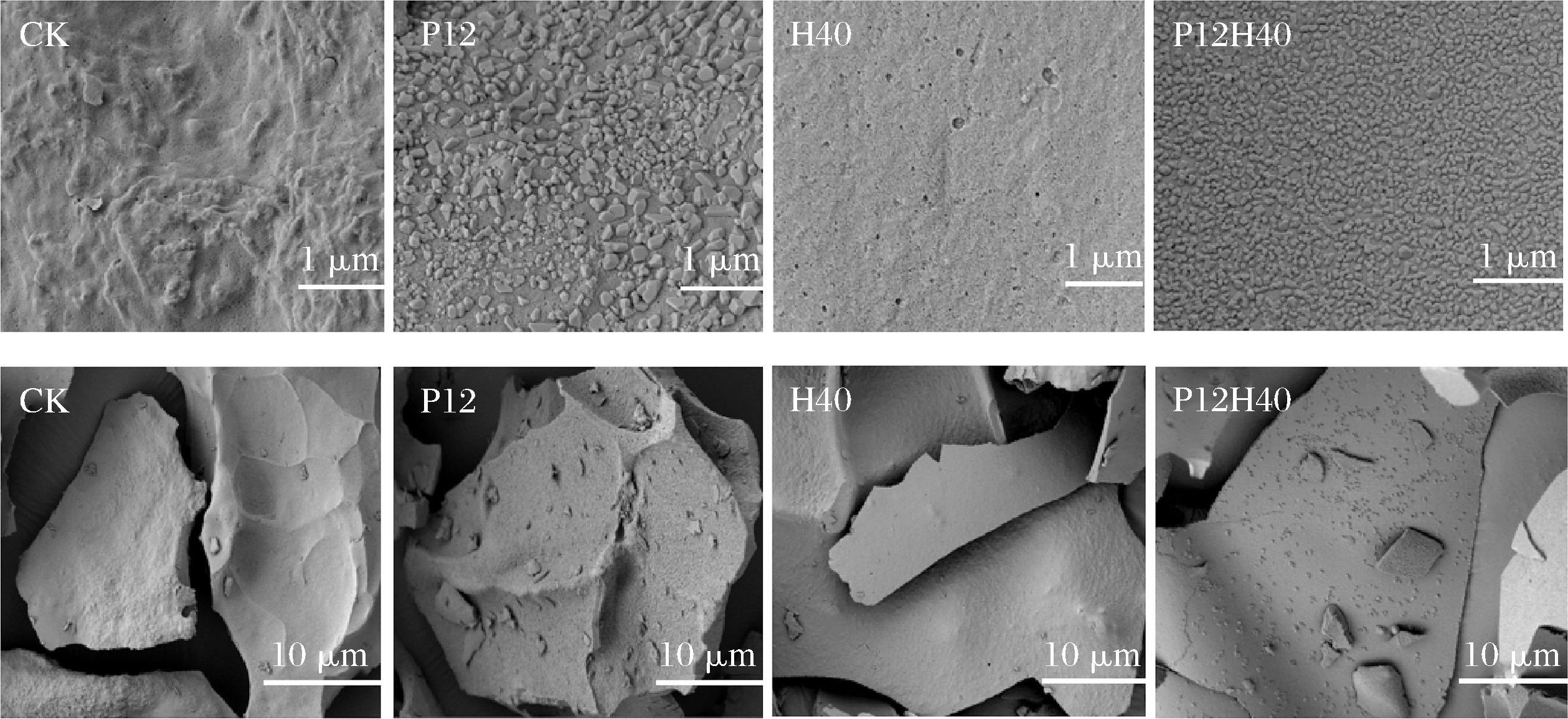 如图3所示,未经处理的CPI的表面形貌相对不规则和粗糙,而P12表面出现小颗粒,但其颗粒分布不均匀,可能在极碱条件下蛋白质结构展开,从而出现小颗粒。H40的表面变得光滑,并出现了孔洞,而两者联合作用使CPI的表面颗粒显著减小且在空间中呈现出高度均一的分散状态,可能是因为高压均质的剪切和空化导致不溶性聚集体的分解和展开,从而形成更分散的蛋白质结构[25]。