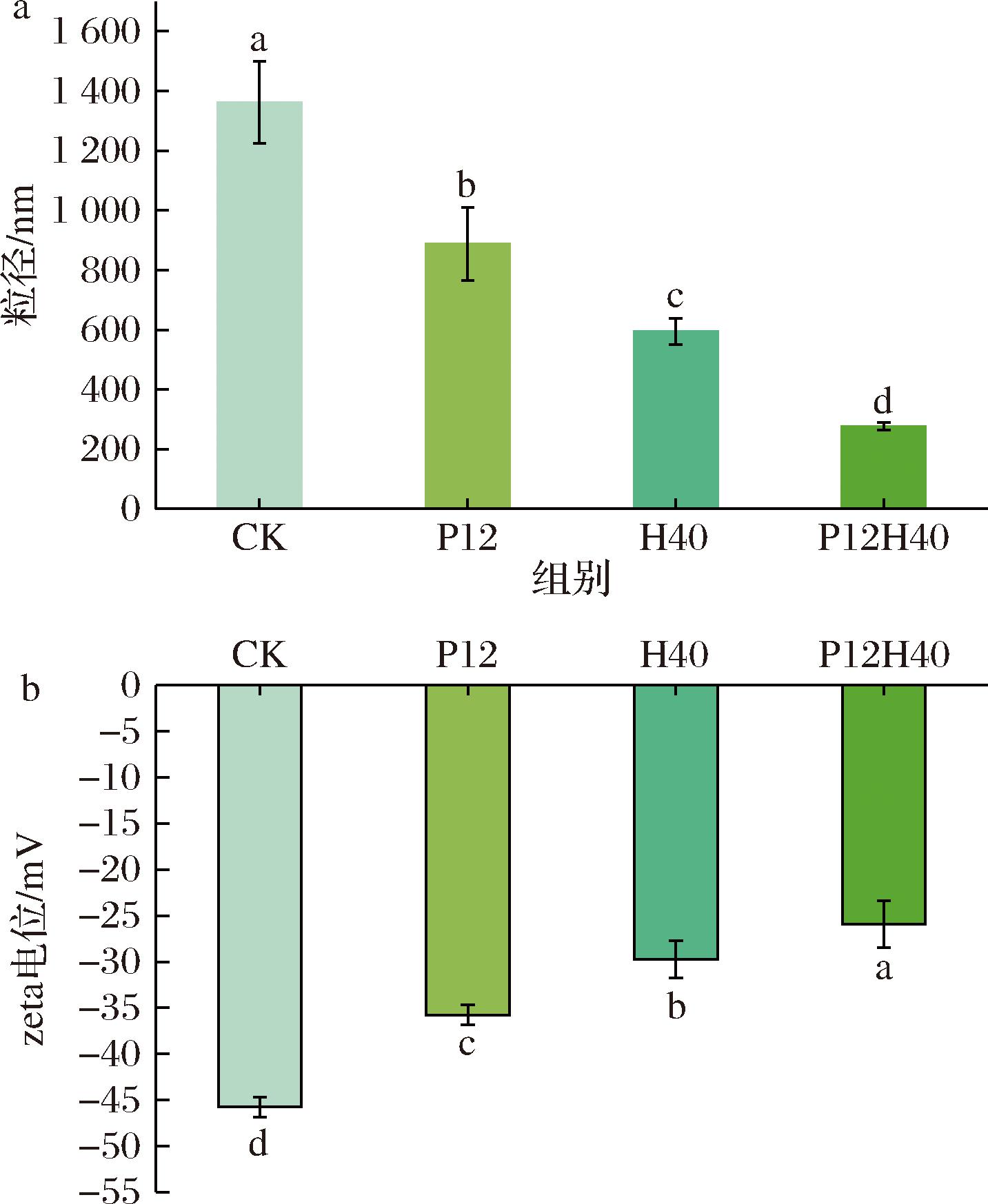 如图1-b所示,与CK相比,经过改性的CPI样品的电位绝对值均显著降低,各样品的zeta电位绝对值排序为:CK>P12>H40>P12H40。其电位绝对值的降低可能是因为在pH变化过程中改变了蛋白质的暴露基团,进而影响了带正电的基团和带负电的基团之间的平衡,从而导致zeta电位的降低[17]。同时高压均质进一步通过剪切力和空化效应破坏蛋白质的聚集体,使蛋白表面暴露出更多的正电荷,削弱了CPI之间的静电斥力[18]。
