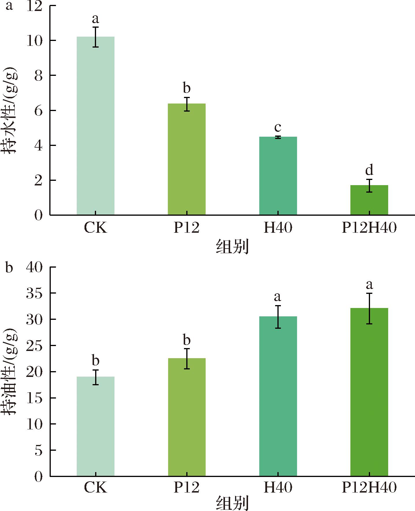 如图5-a所示,与CK相比,P12、H40和P12H40的持水性均显著降低。其中,P12H40的持水性最低。2.1节的结果证明改性后的CPI zeta电位绝对值降低,表明表面净电荷减少,而电荷减少会导致结合水分子数量下降,因此持水性降低。持水性大小排序为:CK>P12>H40>P12H40,这与zeta电位的绝对值变化趋势是一致的。此外,pH偏移先使蛋白质内部疏水基团短暂暴露,随后疏水相互作用促使分子内折叠或分子间聚集,将疏水基团重新包埋至聚集体内部,这种重排引发蛋白质形成致密聚集体,蛋白质网络孔隙率骤减反而会减少水分子截留,最终导致持水性下降[32]。如图5-b所示,所有改性CPI的持油性均高于CK,排序为:CK