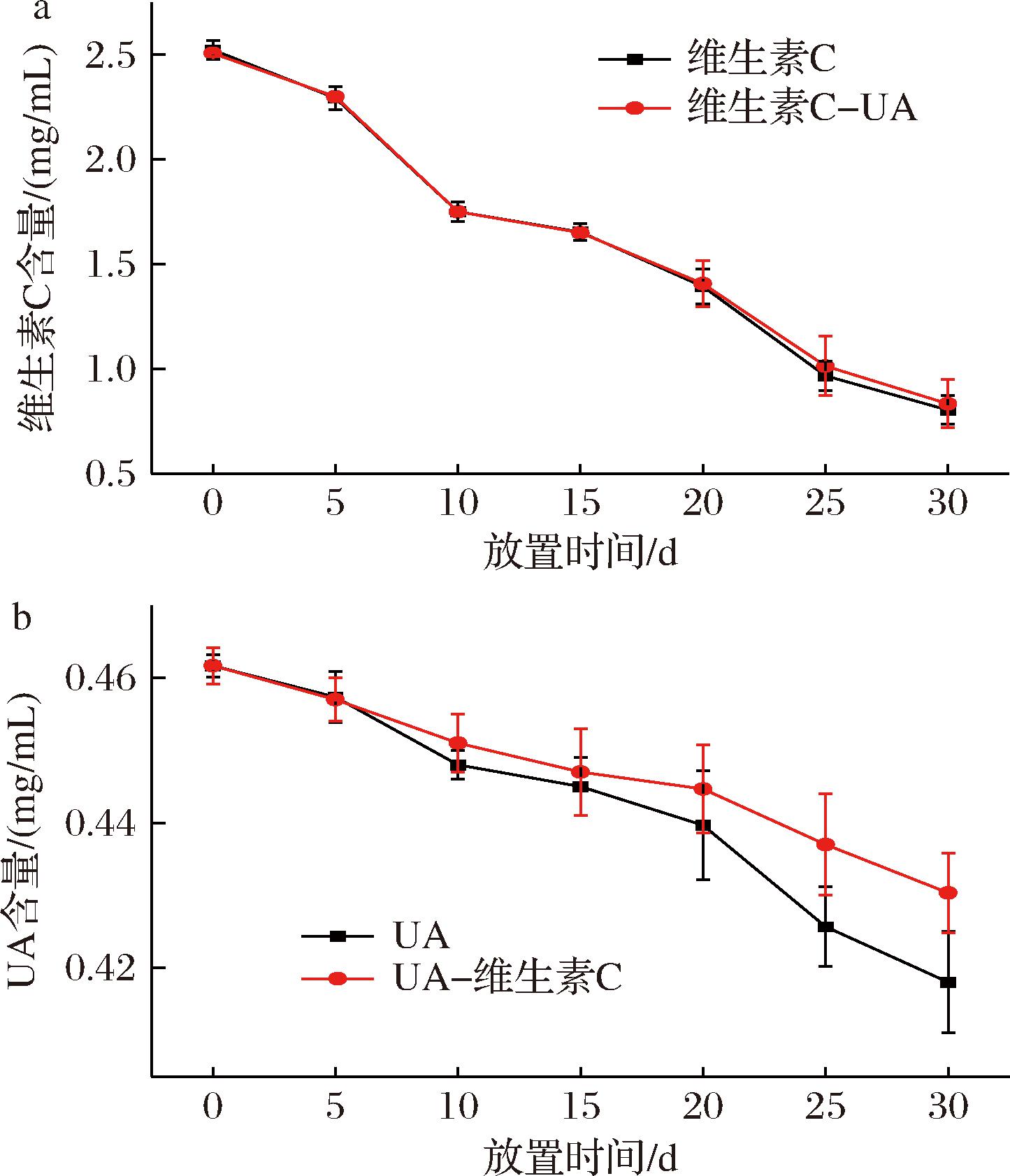 精确量取UA标准溶液2.5 mL置于5 mL离心管中,向其中加入2.5 mL的16.0 mg/mL 维生素C溶液,以维生素C、UA单体溶液为对照,平行组3份,充分混合,分别取样0.5 mL检测,剩余样品放入恒温培养箱中于35 ℃下贮藏,每隔5 d取样0.5 mL检测。维生素C、UA均采用HPLC法检测,具体检测方法参考文献[6]。