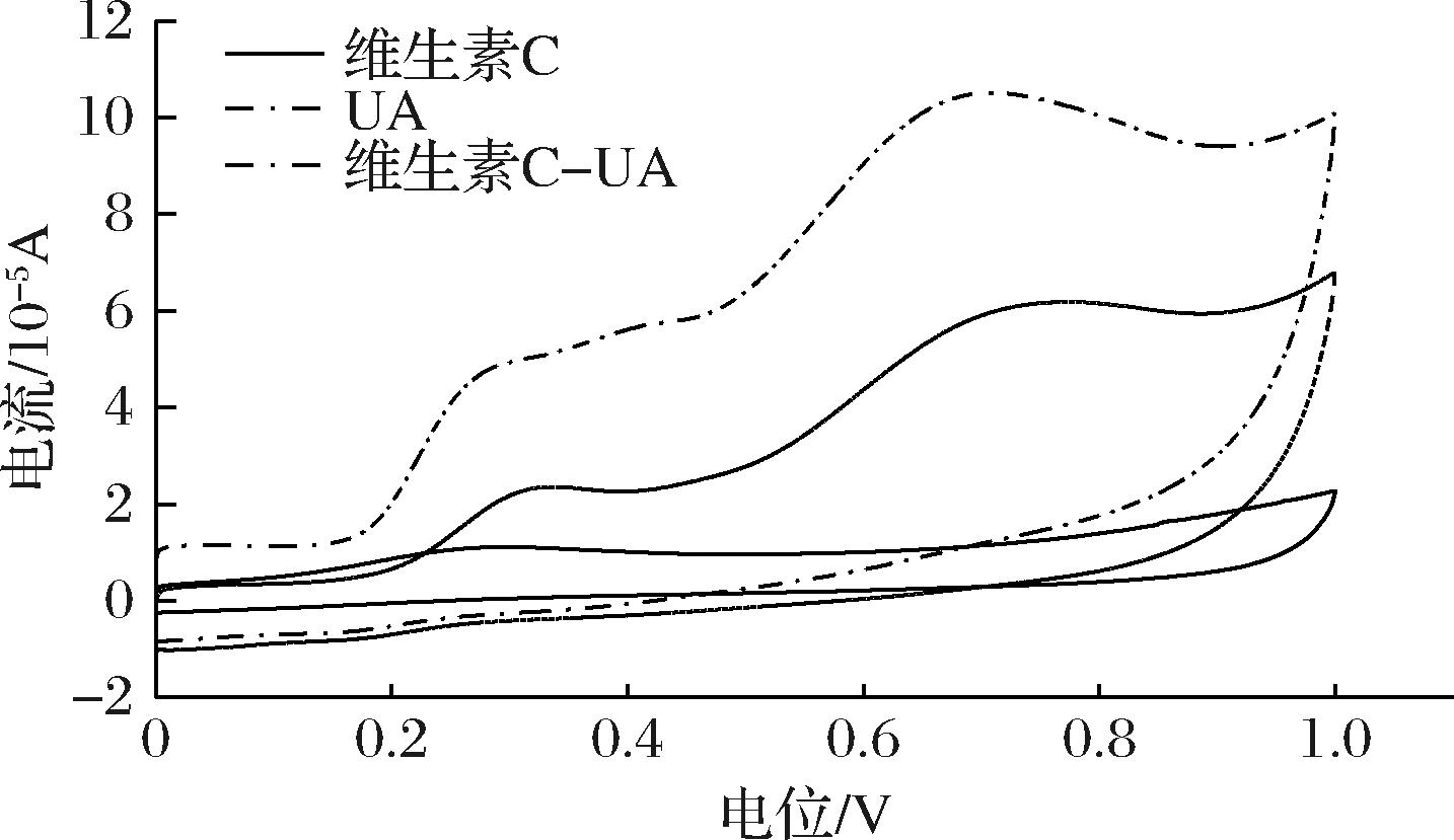 图7 UA、维生素C及UA-维生素C体系的CV曲线