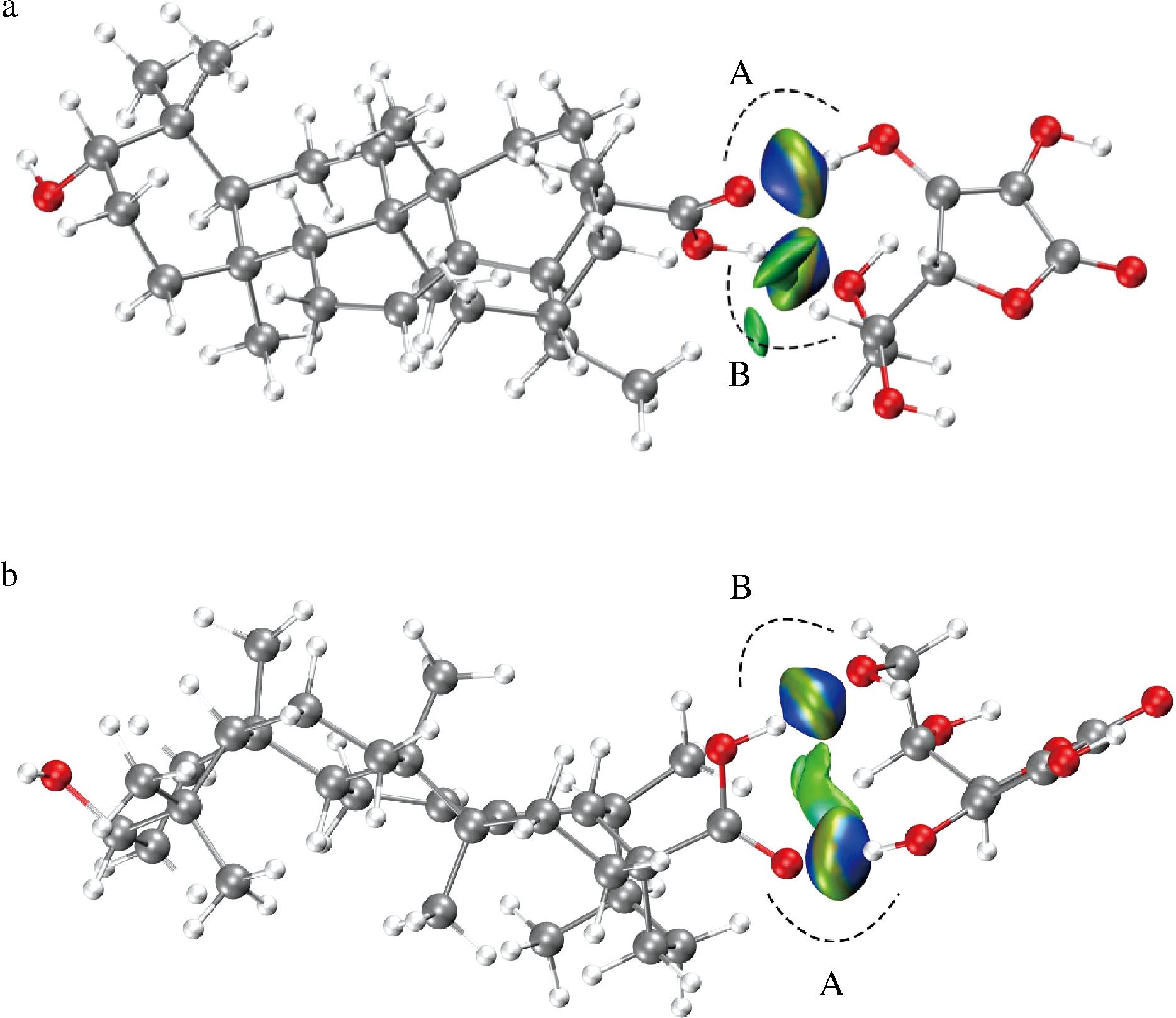 利用ORCA软件,在B3LYP泛函、DFT-D3(BJ)色散校正水平下对维生素C、UA分子进行结构优化,结果如图9-a所示,计算所得无虚频,表明优化后的结构稳定。从图9-b可见,结合位点A(H100…O32)位于维生素C烯二醇结构C-2上的—OH与UA的C-28位—COOH的氧原子之间,结合位点B(O989…H81)处于维生素C羟甲基的—OH与UA的C-28位—COOH的氢原子之间,且这2个结合位点均在IGM可视化图中得到验证,这表明维生素C与UA相互作用的本质是维生素C的烯二醇结构C-2上—OH和C-5羟基(—OH)与UA的C-28位—COOH形成氢键。已有研究发现羧基(—COOH)可作为氢键供体与受体,能和维生素C分子的羟基(—OH)形成氢键[20]。可见,作为UA主要活性基团的C-28位—COOH,能同时作为氢原子的供体和受体与维生素C形成氢键,该结论与紫外、红外光谱及电化学分析结论相似。