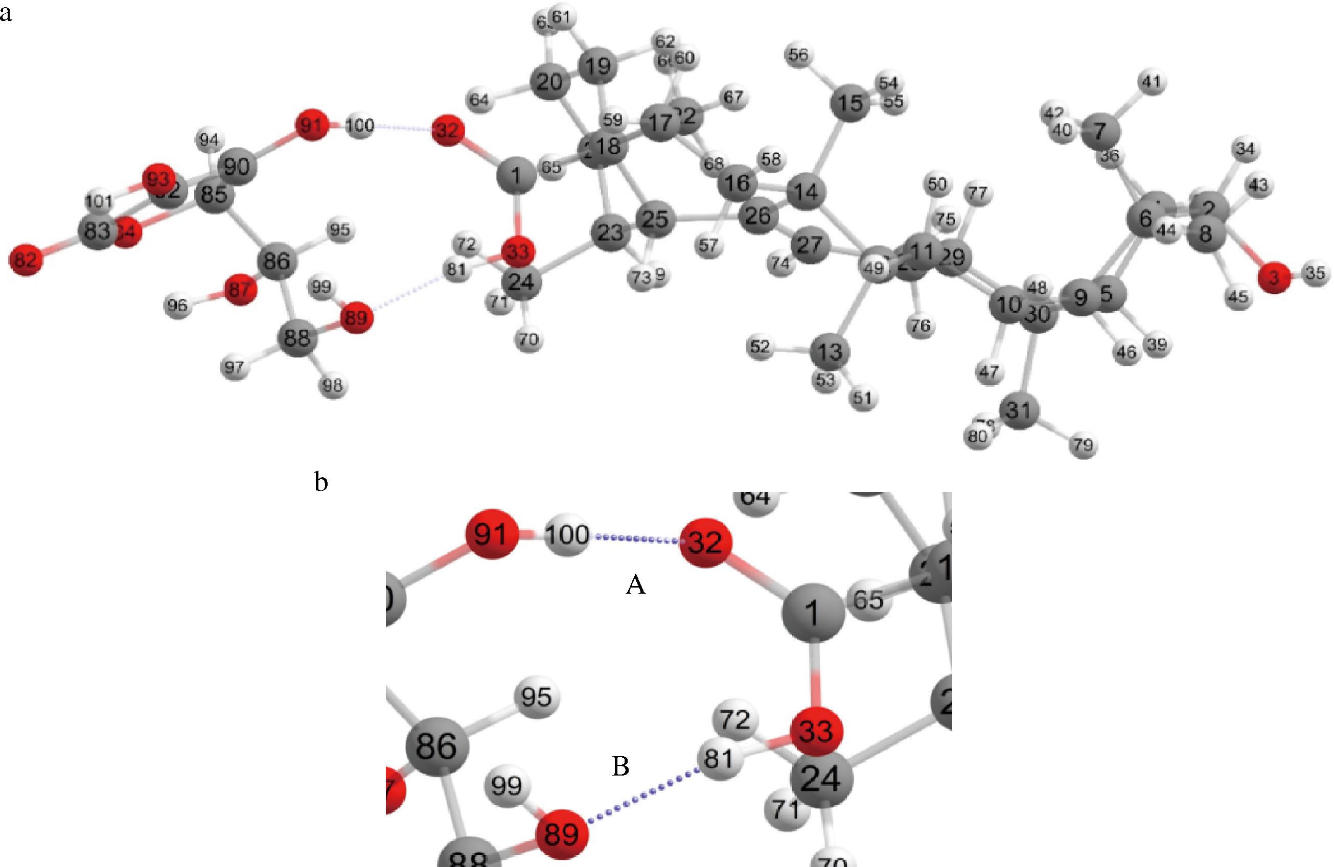 a-单分子维生素C与UA相互作用体系优化后几何构型;b-单分子维生素C与UA相互作用体系的氢键结合位点A(H100…O32)结合位点B(O89…H81)