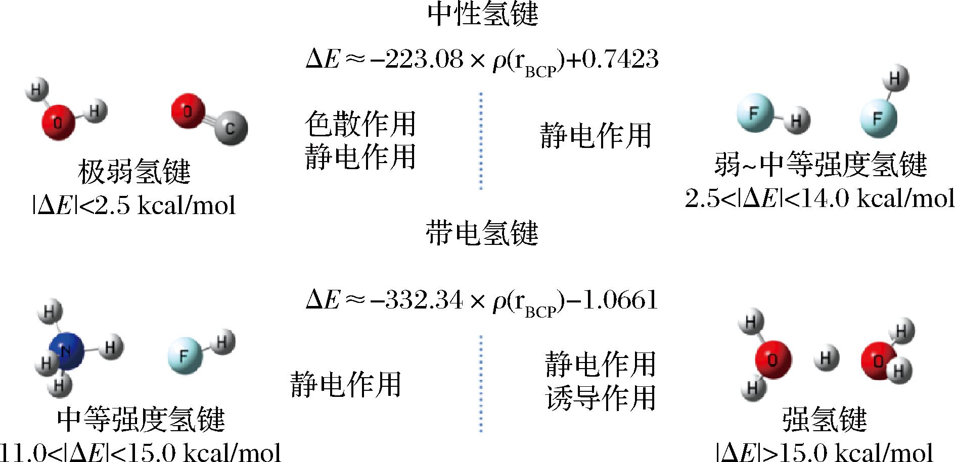 优化后的几何结构信息使用Multiwfn软件采用CCSD(T)方法和Truhlar的“calendar”基组jul-cc-pVTZ方法进行单点能计算,根据结合能计算公式得出结合能,并分析分子间氢键键临界点的电子密度ρ(BCP),得到的ρ(BCP)通过图2的拟合公式计算出氢键键能,以上方法、泛函基组以及拟合公式使用依据参考文献[15]。