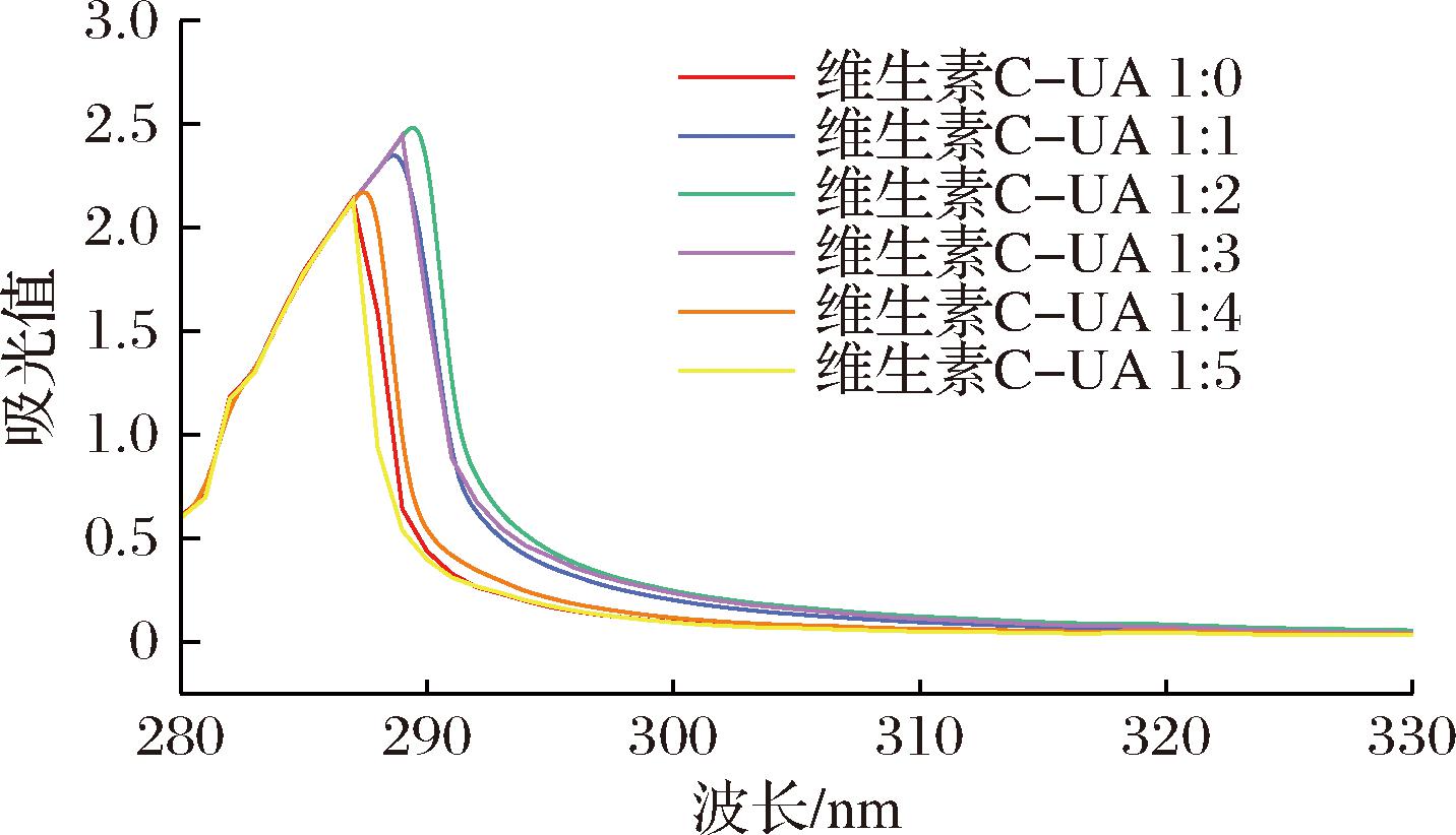 不同浓度UA对维生素C的相互作用紫外光谱图由图4所示, 维生素C∶UA(1∶1~1∶2)为低浓度时,维生素C的最大吸收峰红移,电荷转移复合物形成:UA作为三萜酸(含羧酸基团和疏水骨架),其羧酸基团(—COOH)的羟基可能作为电子供体,与维生素C的烯二醇结构(含富电子双键)形成电荷转移复合物,延长共轭体系,降低激发态能量,导致红移(287.4→290.4 nm)。