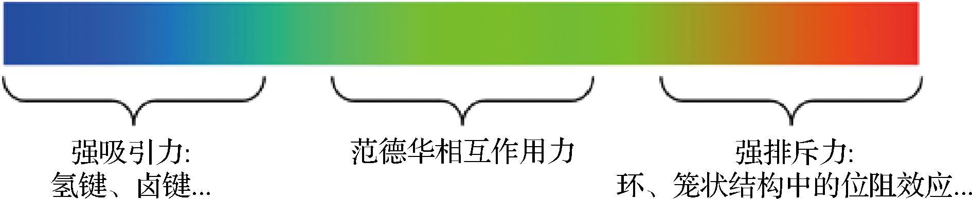 IGM分析方法可以考察分子间非共价相互作用进行空间分布和类型分析,通过分子片段间的作用区域的颜色进行判断,蓝、绿、红分别代表强吸引(氢键、卤键)、范德华力及强排斥,如图1所示: