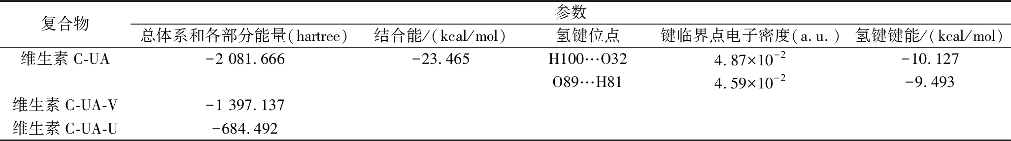 表2 维生素C-UA分子互作结合能、键临界点电子密度及氢键键能