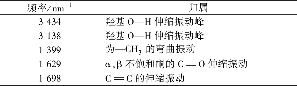 频率/nm-1归属3 434羟基O—H伸缩振动峰3 138羟基O—H伸缩振动峰1 399为—CH3的弯曲振动1 629α,β不饱和酮的CO伸缩振动1 698CC的伸缩振动