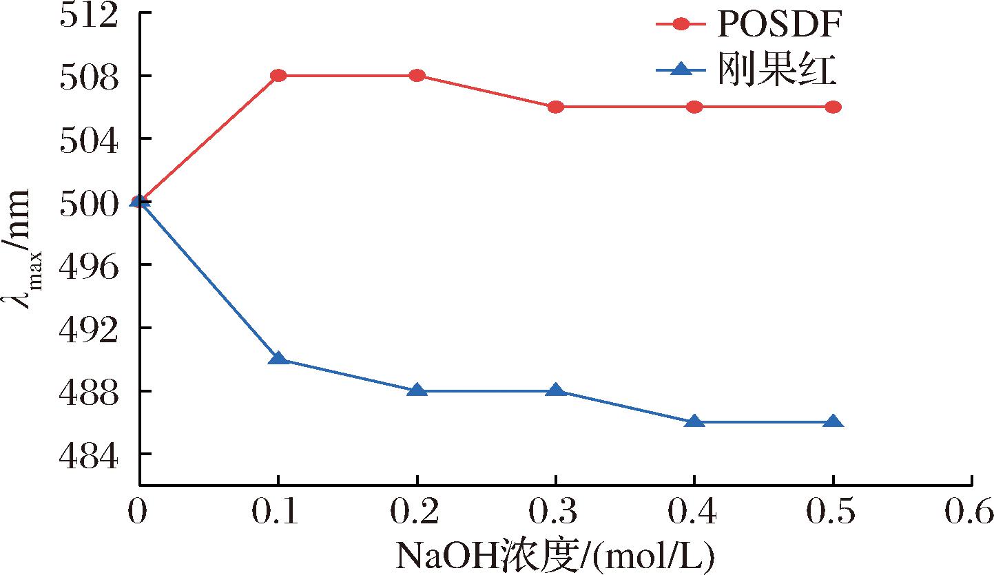 图7 刚果红与POSDF复合物在不同浓度NaOH溶液下的最大吸收波长
