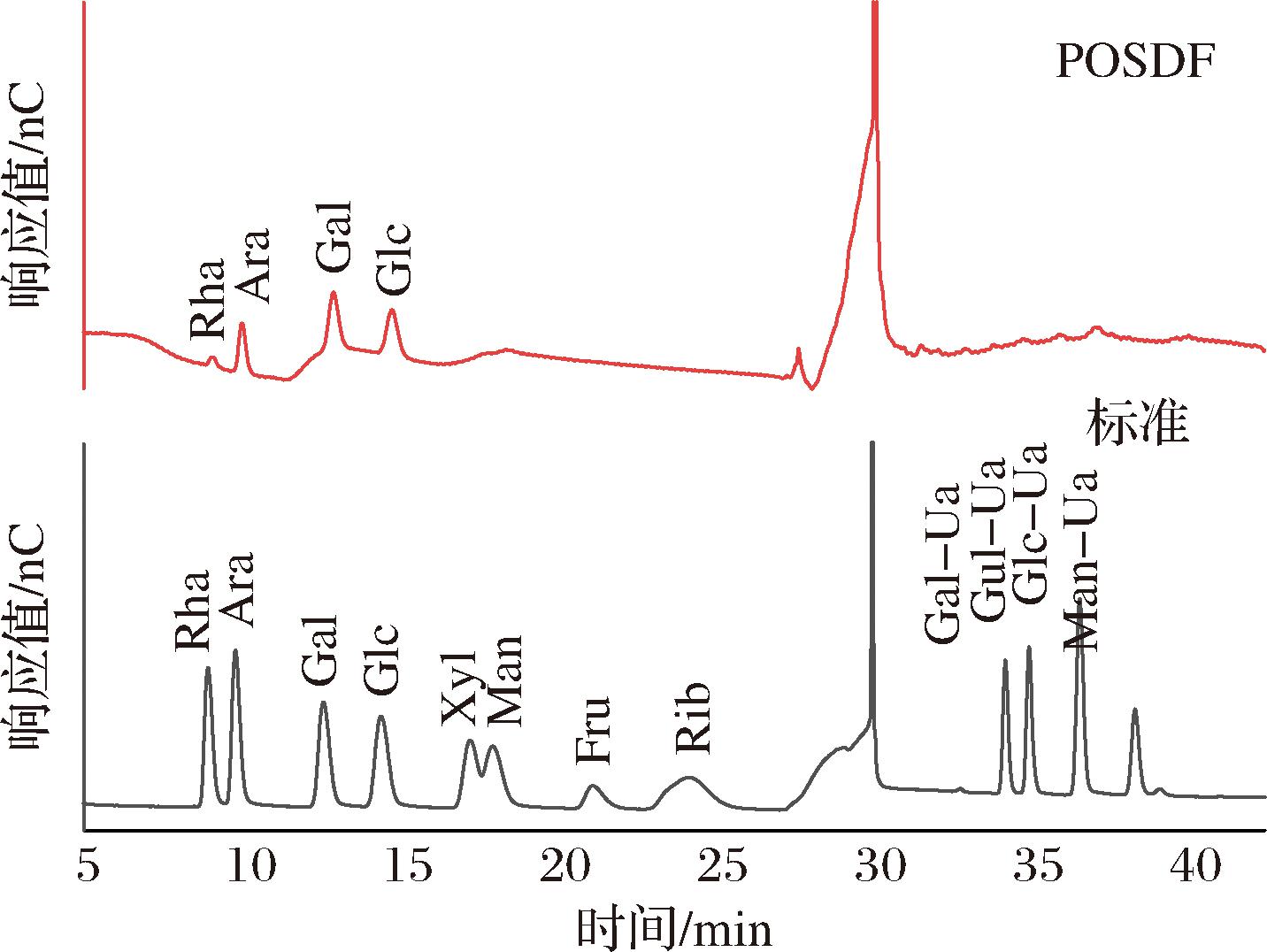 如图4所示,通过各峰的保留时间,并对照混合单糖标品图,经计算后可知,POSDF主要由鼠李糖(4.66%)、阿拉伯糖(19.20%)、葡萄糖(30.17%)和半乳糖(45.97%)组成,摩尔质量比为1∶4.5∶5.9∶9.0。研究表明[2],半纤维素的主要组成包括木糖、阿拉伯糖、葡萄糖、半乳糖,POSDF组成与之相似,说明其含有一定的半纤维素成分,但未检测出木糖,推测是由于木糖较难溶出导致[14]。而半纤维素不仅可以延缓食物的吸收和胃的排空,减缓血糖上升速度,还可作为益生元来源,调节肠道菌群促进肠胃消化[15]。因此,可以推测POSDF具有一定的降血糖生物活性。