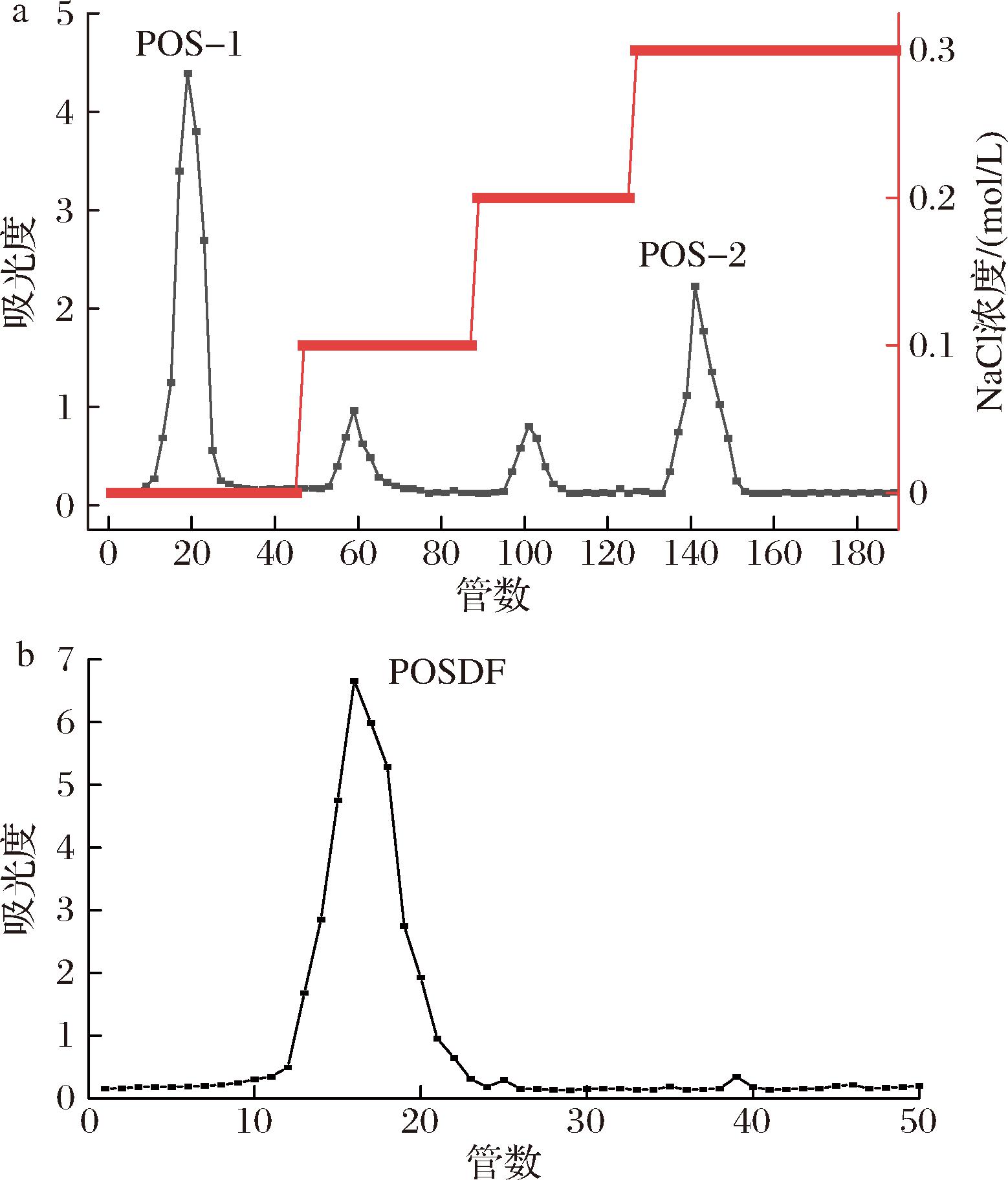使用Sephadex G-50凝胶柱分离经DEAE-52柱层析分离得到的组分,按1.2.1.4节的方法得到洗脱曲线。收集主要组分透析后冻干,得到纯化样品,命名为POSDF。