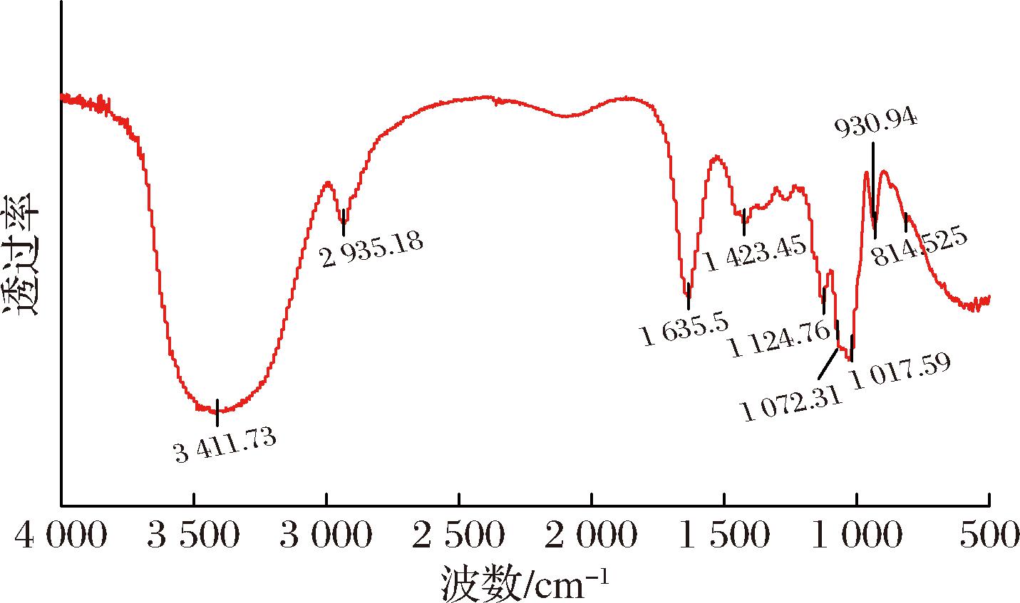 本研究采用红外光谱及核磁共振分析共同对POSDF的官能团及分子结构进行表征。如图5所示,波数在3 411 cm-1的强吸收峰是纤维素O—H伸缩振动的典型表现[16],而2 935 cm-1处的吸收峰反映出多糖特有的甲基伸缩振动。此外,1 635.5 cm-1的吸收峰可能为C