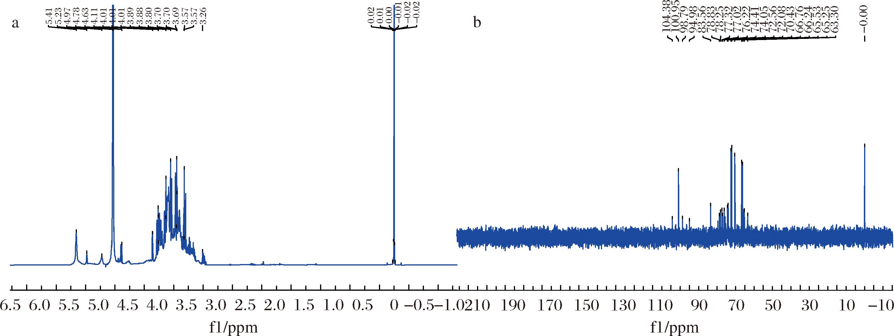 通过核磁共振谱图的表征,进一步确定主体组成及糖苷键构型。图6-a中,除4.79 ppm为溶剂水峰信号外,信号主要集中在3.0~5.5 ppm,为多糖核磁氢谱的典型特征,且同时含有α和β型糖苷键。位于4.8~5.5 ppm出峰,判断有主要的1种α构型残基,推测可能为阿拉伯糖或者葡萄糖的异头H1;在4.2~4.8 ppm的出峰为少量比例的β构型残基,结合单糖组成,推断为半乳糖β残基;而高场1.35 ppm区域的几组弱峰,代表了结构中较少的鼠李糖残基的H6信号。图6-b中信号较弱,但可以推测,在108.56 ppm 和106.67 ppm附近的信号归属为POSDF中阿拉伯糖残基的异头C1,101.35 ppm附近的为半乳糖残基的异头C1,97.91 ppm附近的为葡萄糖残基的异头C1。其中,位于84 ppm附近出峰判断为阿拉伯残糖或半乳糖的3位置糖苷键碳所对应;而位于相对高场的63 ppm和65 ppm附近出峰则归属于未形成糖苷键的阿拉伯糖C5或者半乳糖和葡萄糖的C6。