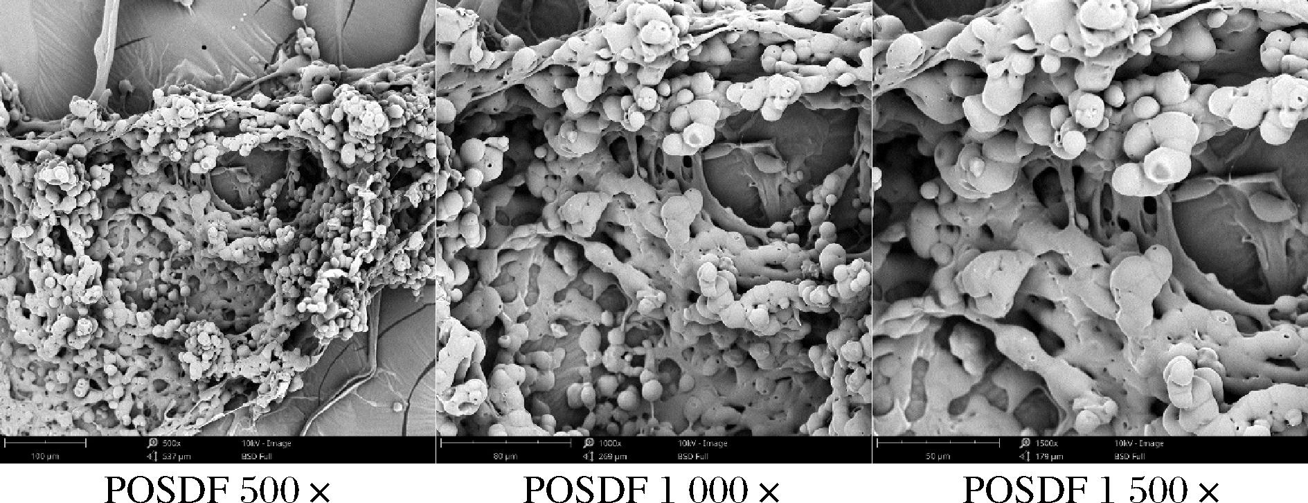如图8所示,POSDF呈现出蓬松多孔的纤维球状结构和复杂的空间网状结构,整体结构松散,孔隙大小不一。并且其球状结构上布满小孔,整体比表面积较大,进而暴露的活性基团较多,有利于对水分子、葡萄糖和胆固醇的吸附,具有较强的生物活性。