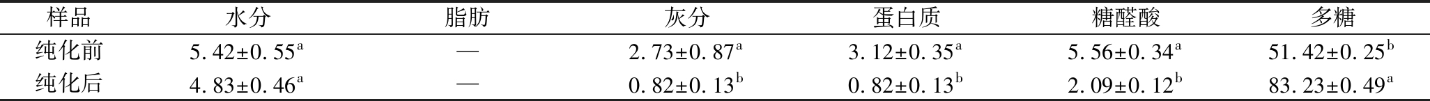 样品水分脂肪灰分蛋白质糖醛酸多糖纯化前5.42±0.55a—2.73±0.87a3.12±0.35a5.56±0.34a51.42±0.25b纯化后4.83±0.46a—0.82±0.13b0.82±0.13b2.09±0.12b83.23±0.49a