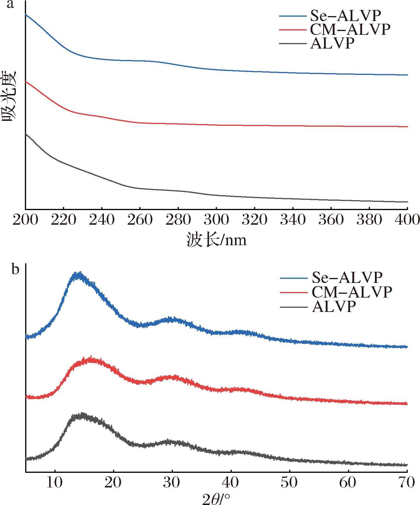 将ALVP、Se-ALVP和CM-ALVP多糖分别配制成质量浓度为0.2 mg/mL水溶液,采用UV-Vis仪在200~400 nm扫描,得紫外谱图。